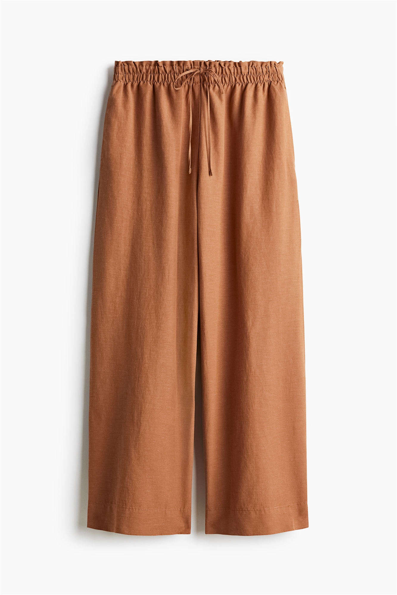 Свободные брюки с воздушным плетением из смеси льна. Высокая талия с эластичным швом, узким шнурком и небольшой оборкой. Небрежные боковые карманы и широкие штанины длиной до щиколотки.