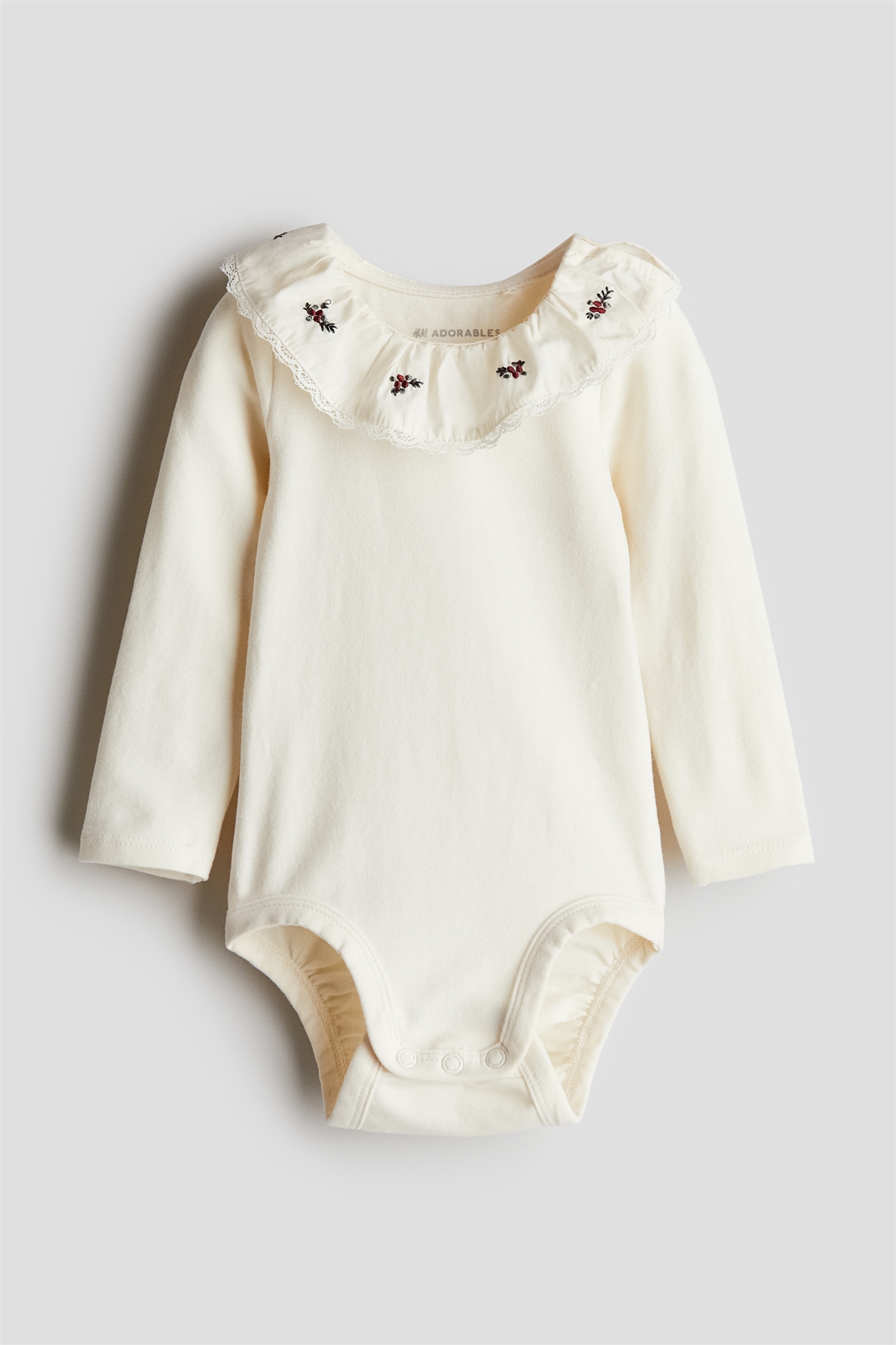 H&M Adorables. Боди с длинными рукавами из мягкого джерси, изготовленного из высококачественного хлопка. Боди-комбинезон имеет закругленный тканый воротник с нежной кружевной отделкой. Пуговицы на одном плече и два ряда пуговиц внизу для регулировки длины. Наш хлопок имеет высокий показатель GSM, что означает более плотное и прочное качество без ущерба для комфорта. Коллекция H&M Adorables - это подборка качественных вещей с высоким уровнем комфорта, которые не подвластны времени.