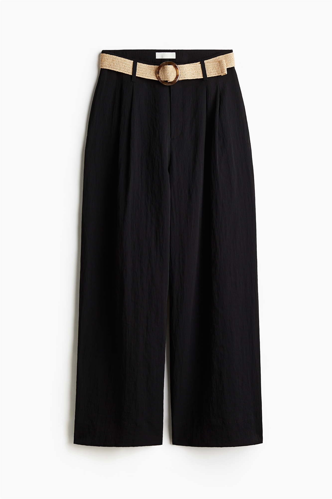 Брюки из тканого материала с высокой талией, ширинкой на молнии, потайной застежкой на крючки и глазки и широким плетеным поясом с круглой пряжкой. Свободный крой с неброскими боковыми карманами, втачными задними карманами и широкими ногами со складками спереди.