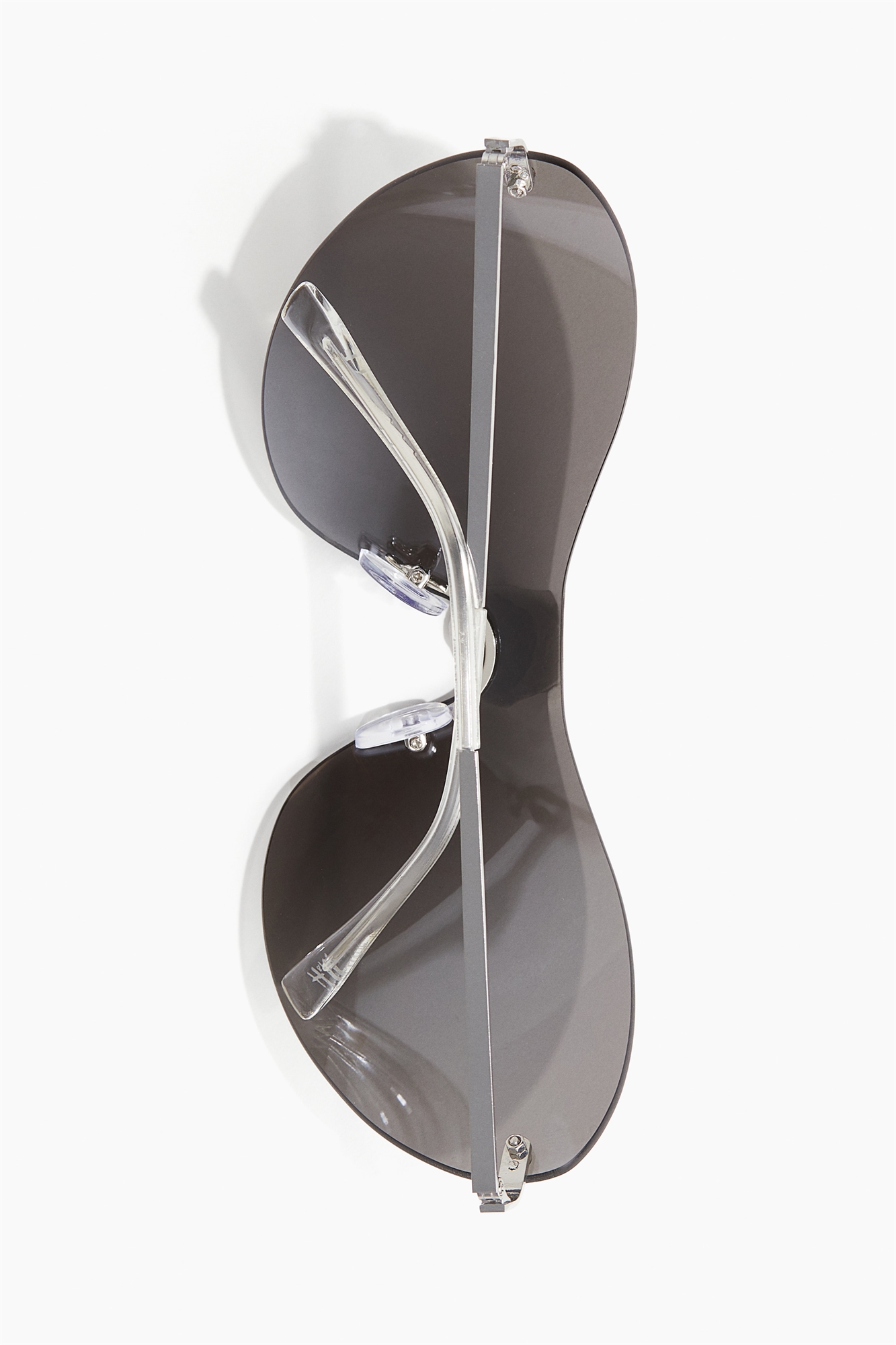 Спортивные солнцезащитные очки с боковыми дужками из металла и пластика и регулируемыми носовыми упорами. Тонированные пластиковые линзы с УФ-защитой.