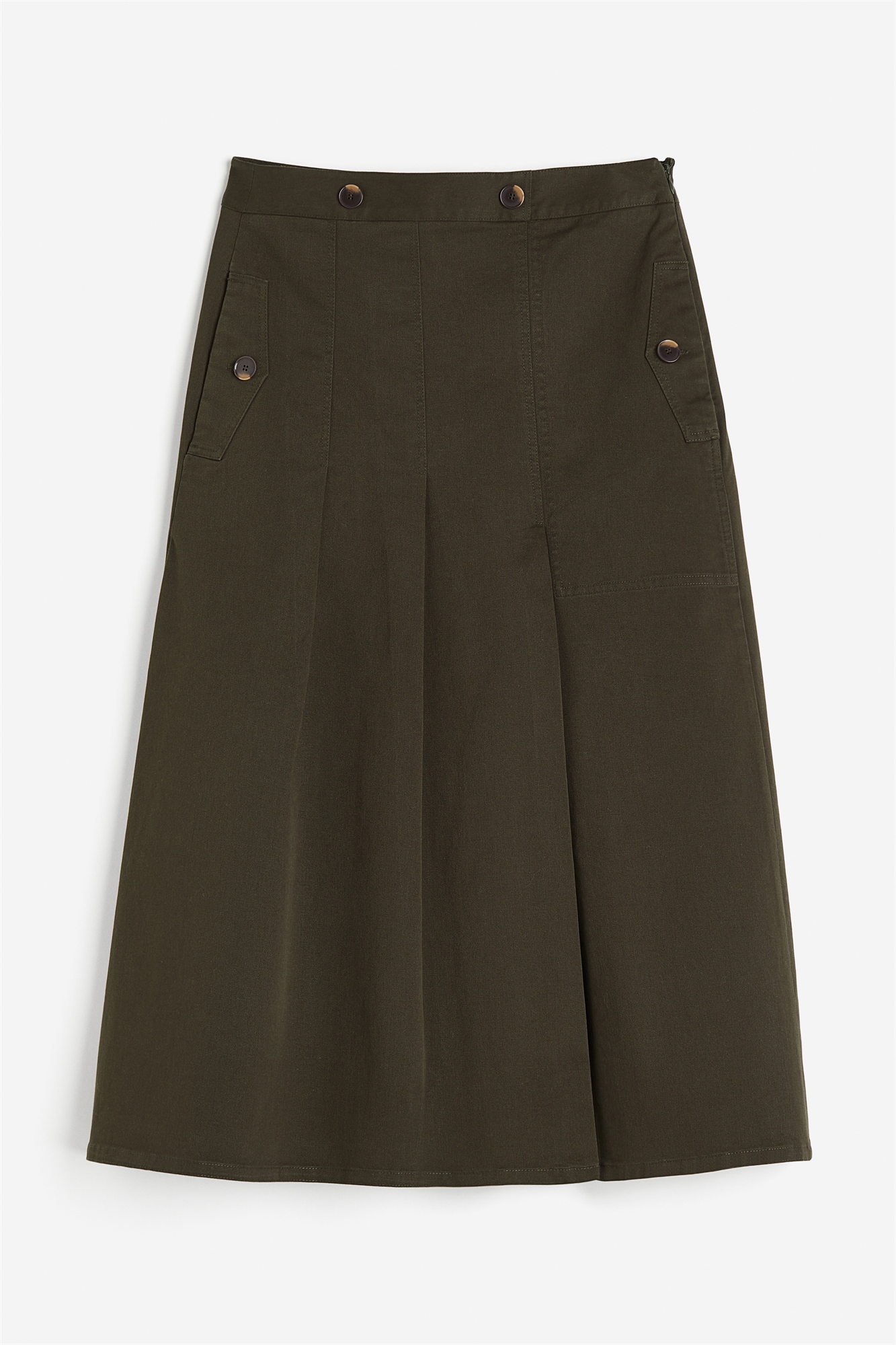 Круглая юбка из хлопковой саржи с декоративными пуговицами спереди, боковыми карманами с декоративным клапаном и пуговицей, а также потайной застежкой-молнией с одной стороны. Плиссировка для придания дополнительной ширины и разрез спереди.