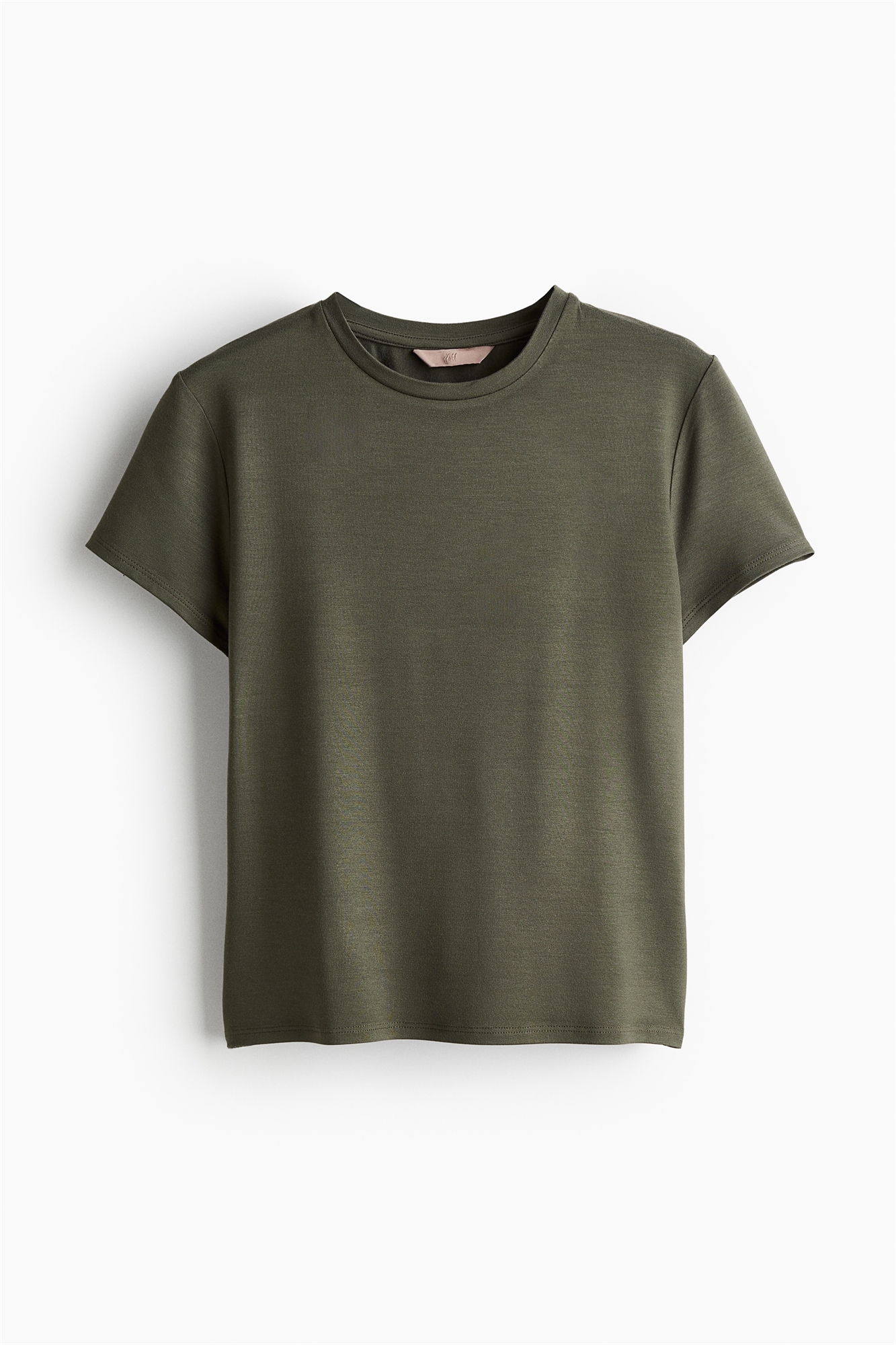 Короткая приталенная футболка из мягкого вискозного джерси с узкой окантовкой по вырезу горловины.