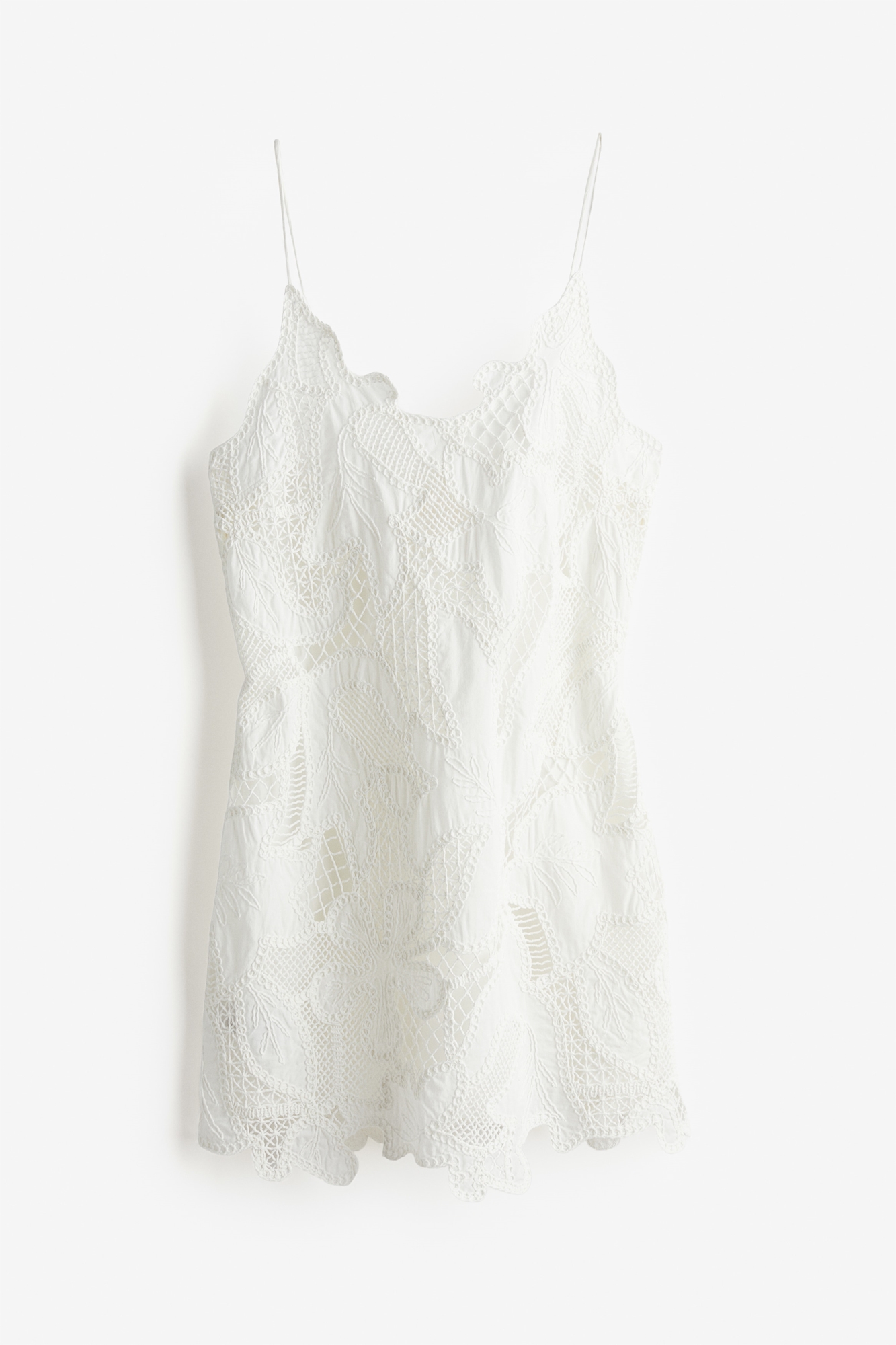 Короткое приталенное платье из воздушного хлопкового полотна с отделкой бродери-англизе. Глубокий вырез, регулируемые бретели-спагетти, потайная застежка-молния и застежка-крючок с одной стороны. Обрезные края по вырезу и подолу. На подкладке.