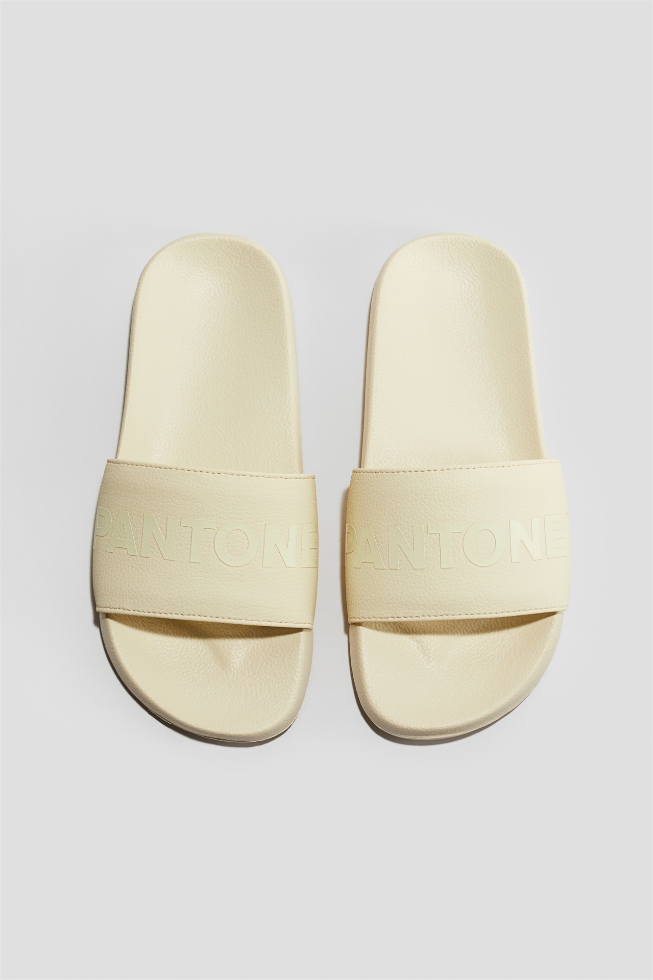 H&M x PANTONE. Слипы для бассейна с мягким ремешком для ног и тисненым текстовым принтом. Формованная рифленая подошва. Высота подошвы 2,6 см.