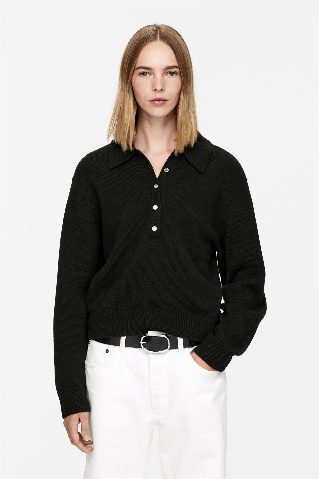 Вязаный джемпер-поло из шерсти. Классический воротник и застежка на пять пуговиц. Ребро по подолу и манжетам. Свободный крой. Джемпер содержит 100% шерсти RWS (TE-00047206). Продукция, сертифицированная по стандарту ответственной шерсти (RWS), содержит шерстяное волокно с ферм, прошедших независимую сертификацию на соответствие требованиям по благополучию животных и землепользованию.