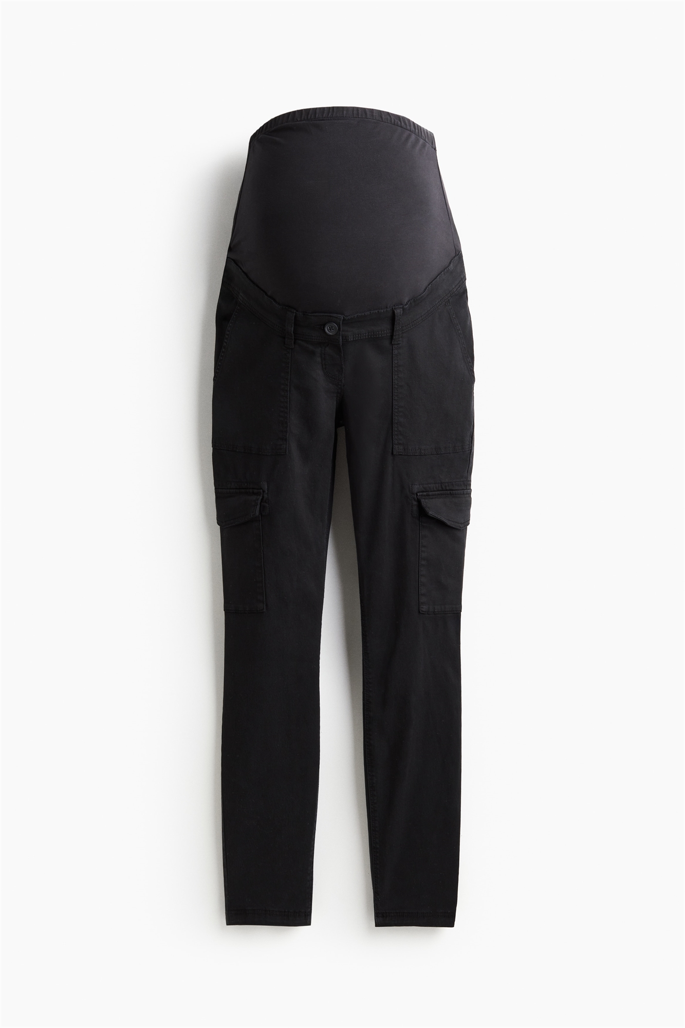 Зауженные брюки-карго из саржи, выполненной из смеси лиоцелла и хлопка. Фальшивая ширинка с пуговицей и широкая трикотажная панель на талии для лучшей посадки на животе. Накладные карманы спереди, фальшивые карманы с клапанами сзади и накладные карманы на ногах.