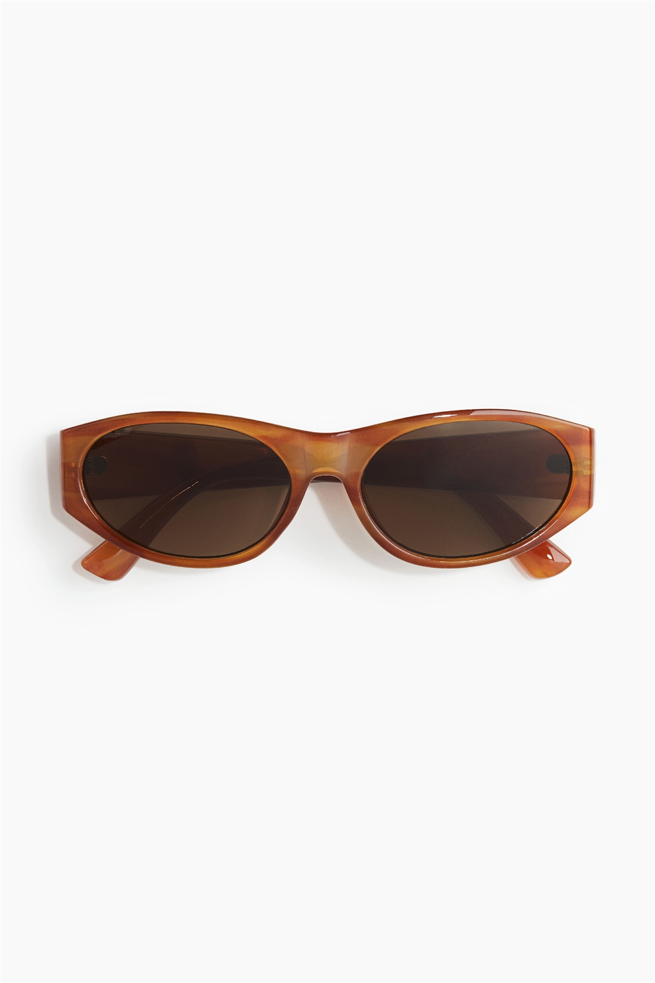 Овальные солнцезащитные очки с пластиковой оправой и тонированными линзами из пластика с защитой от ультрафиолета.