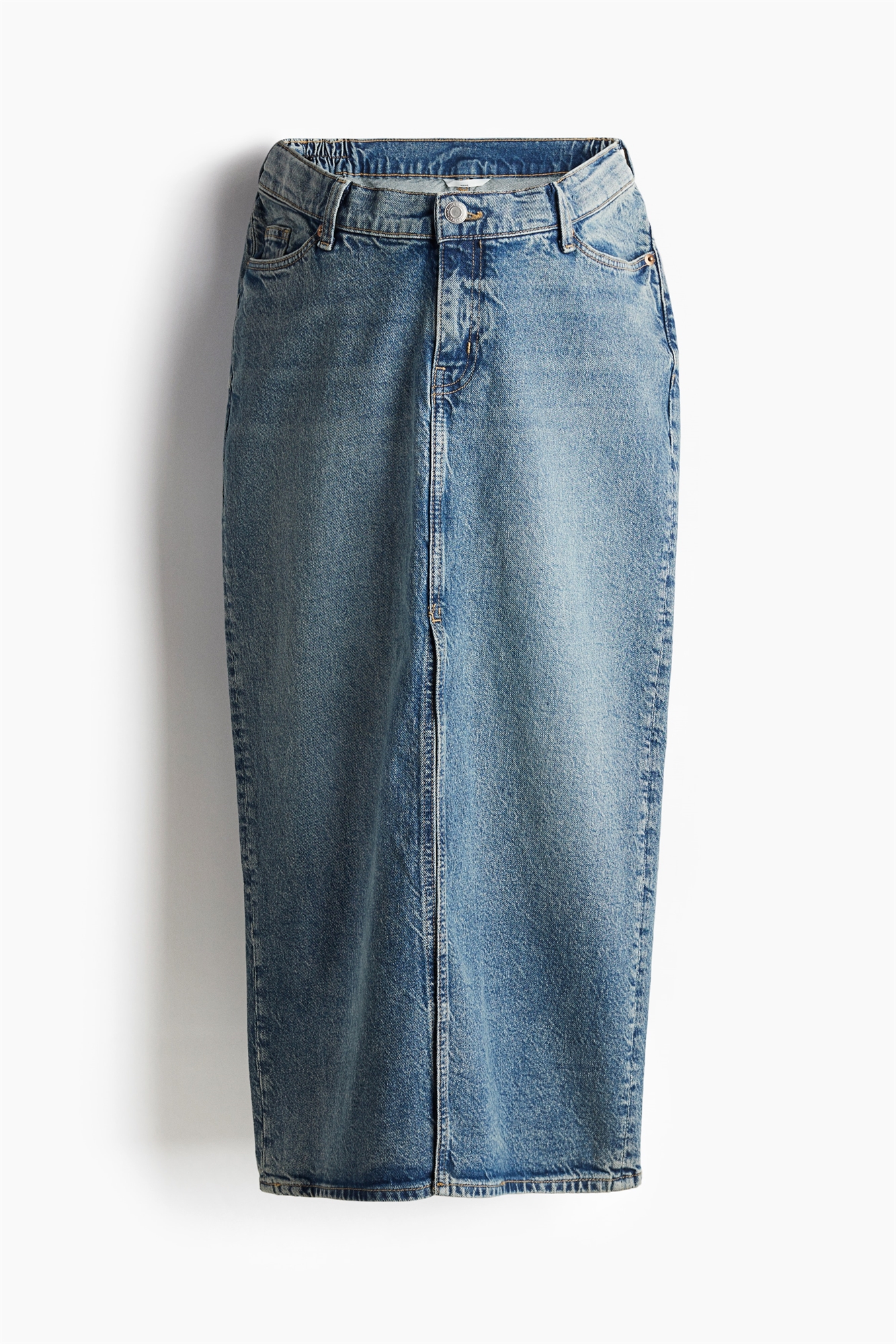 Приталенная юбка длиной до колен с 5 карманами из хлопкового денима с легким стретчем для комфорта. Заниженная талия, ширинка на молнии и пуговице, подол прямого кроя с высоким разрезом спереди. Регулируемая резинка в поясе позволяет регулировать ширину талии, что позволяет носить юбку как во время беременности, так и после нее.