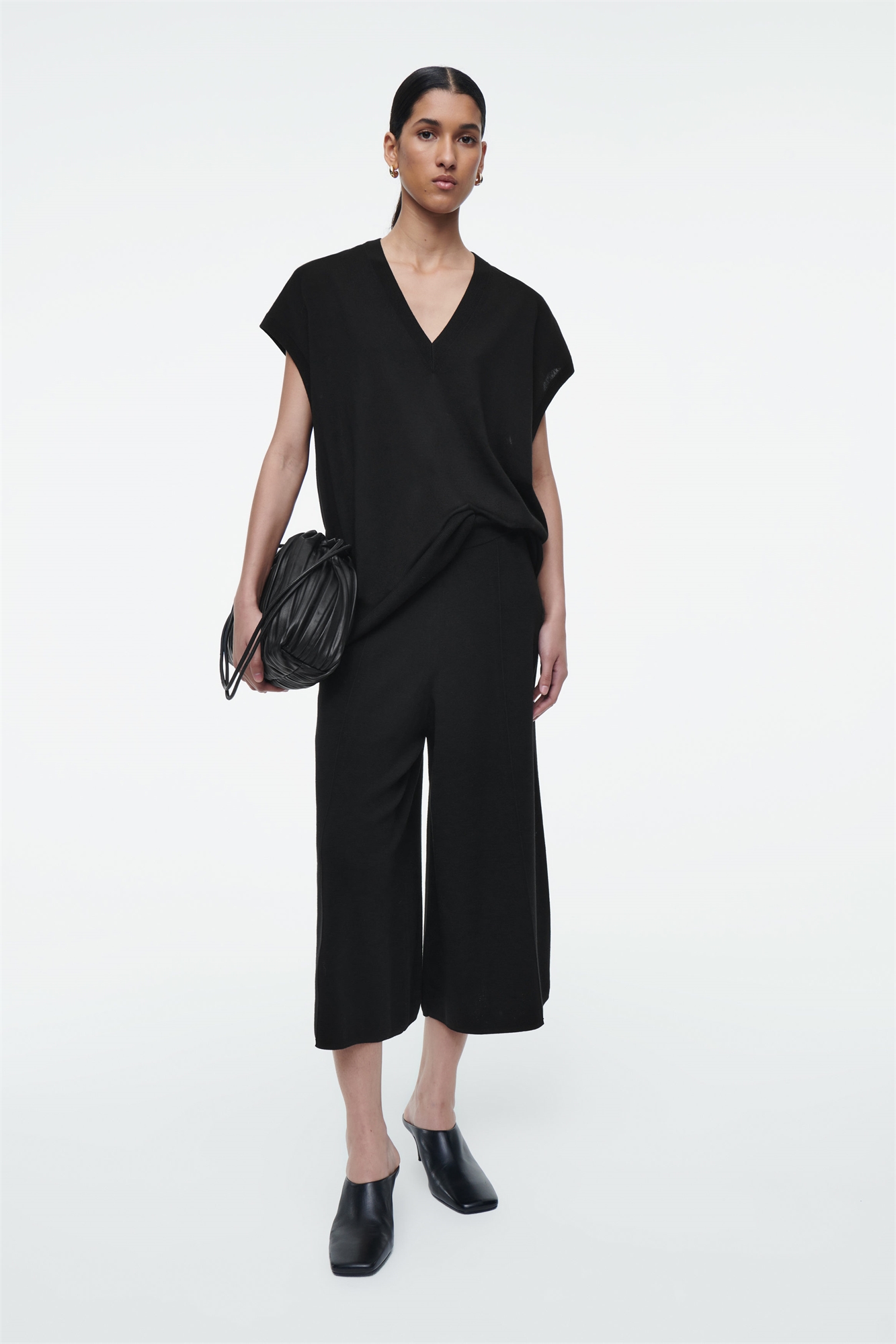 Эти современные кюлоты из высококачественной мериносовой шерсти удобны и изысканны. Они выполнены в простом черном цвете, имеют эластичный пояс и укороченные широкие ноги. Дополните образ подходящим топом. Этот товар сертифицирован в соответствии со стандартом ответственного использования шерсти TE-00047206 (RWS) и содержит шерстяные волокна с ферм, сертифицированных в соответствии с правилами содержания животных и ведения сельского хозяйства Внешний материал: 100 % мериносовая шерсть. Пояс: 87 % переработанного полиэстера, 13 % эластана. Детали исключены/Машинная стирка Внутренняя длина ноги в размере S = 50 см/Модель носит размер S