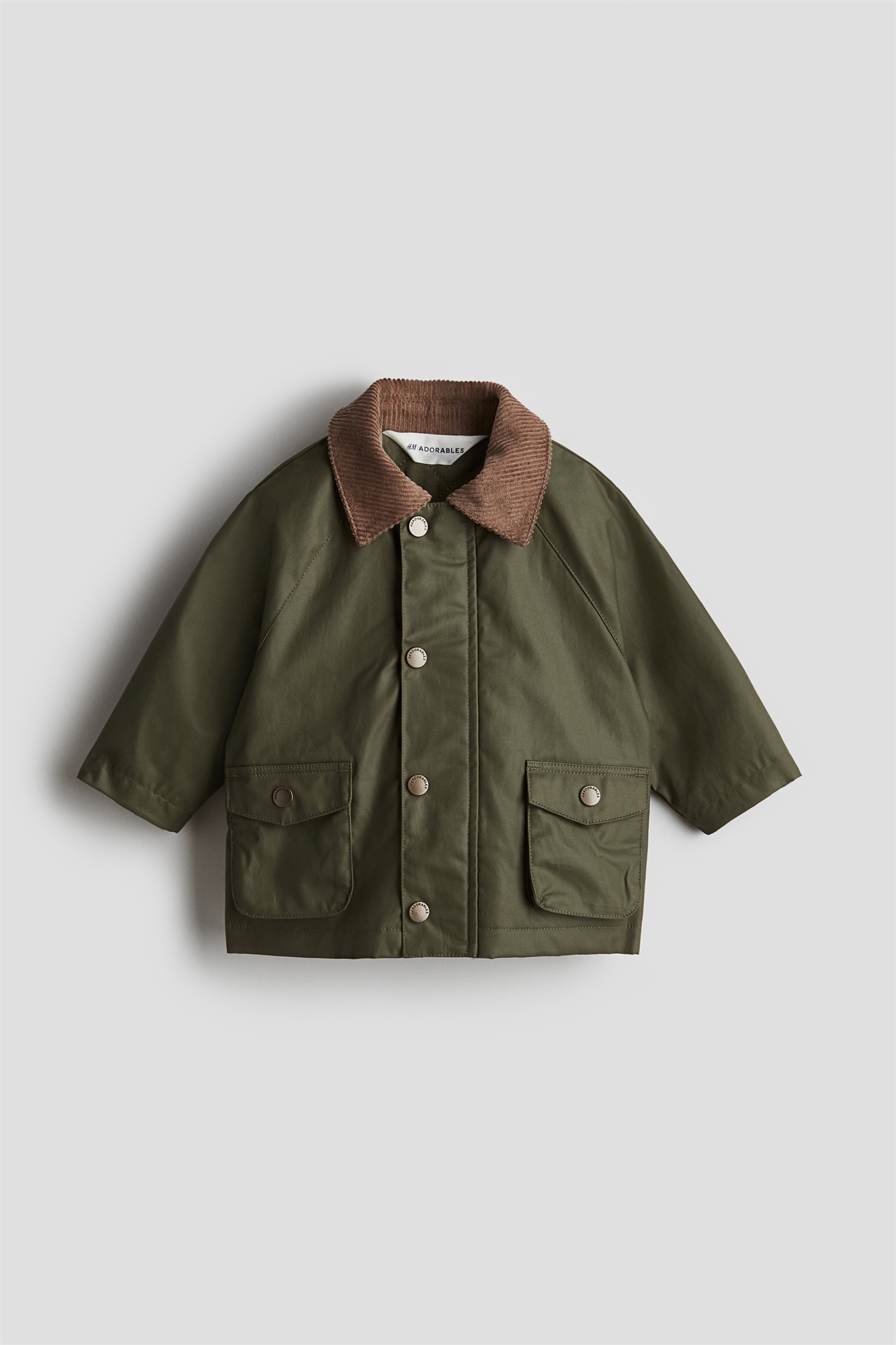 H&M Adorables. Хлопковая куртка на легкой подкладке из вощеной саржи с отложным воротником из вельвета и рукавами реглан. Застежка спереди с кнопками и потайной металлической молнией. Накладные передние карманы с клапаном и кнопкой. Хлопковая подкладка. Коллекция H&M Adorables - это подборка удобных и качественных вещей, не теряющих актуальности.
