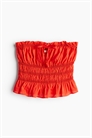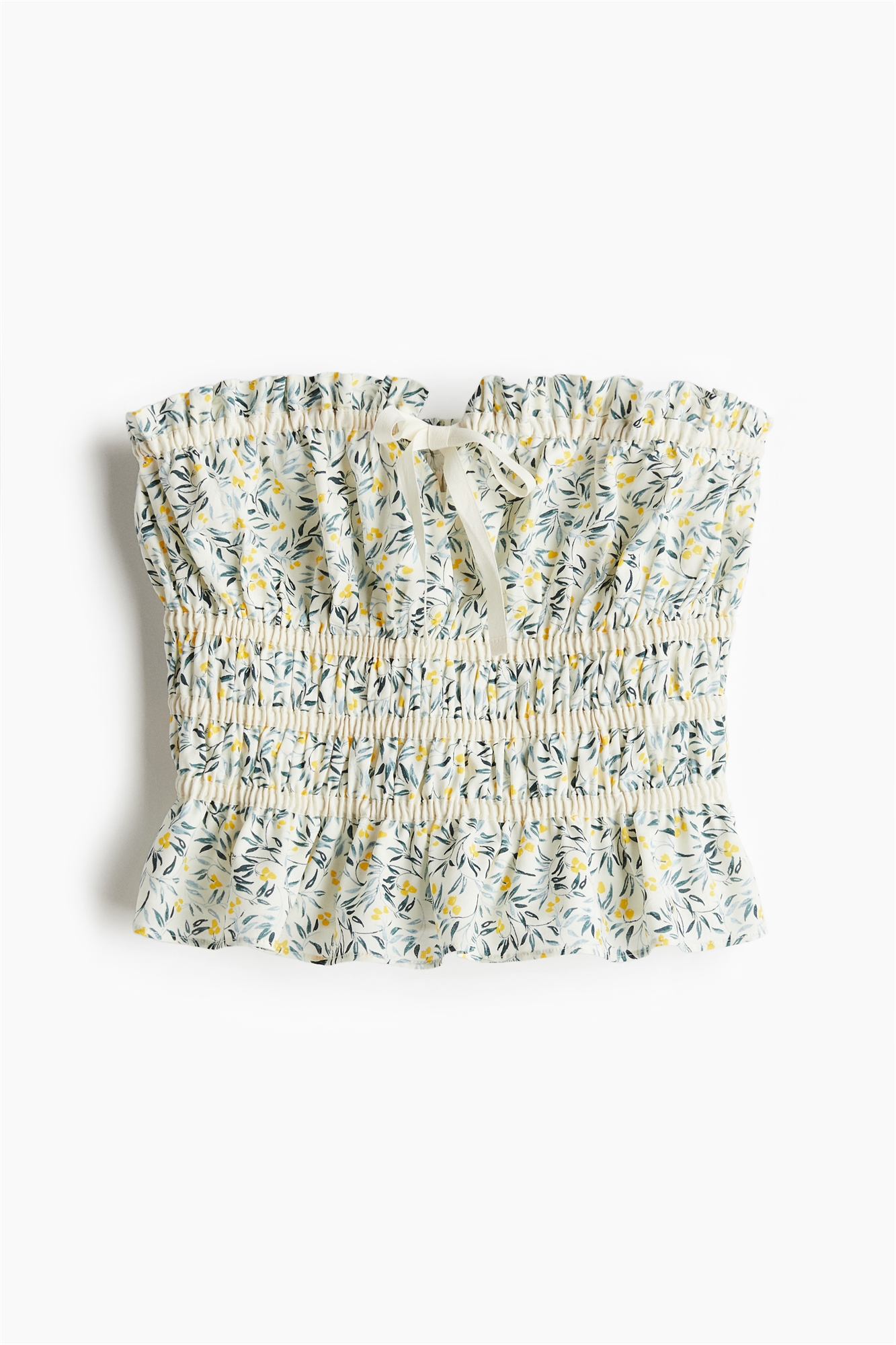 Короткий топ-бандо из тканого материала с V-образной проймой спереди, небольшой оборкой и завязывающимся спереди шнурком. Завязки на талии и подол со складками. На подкладке.