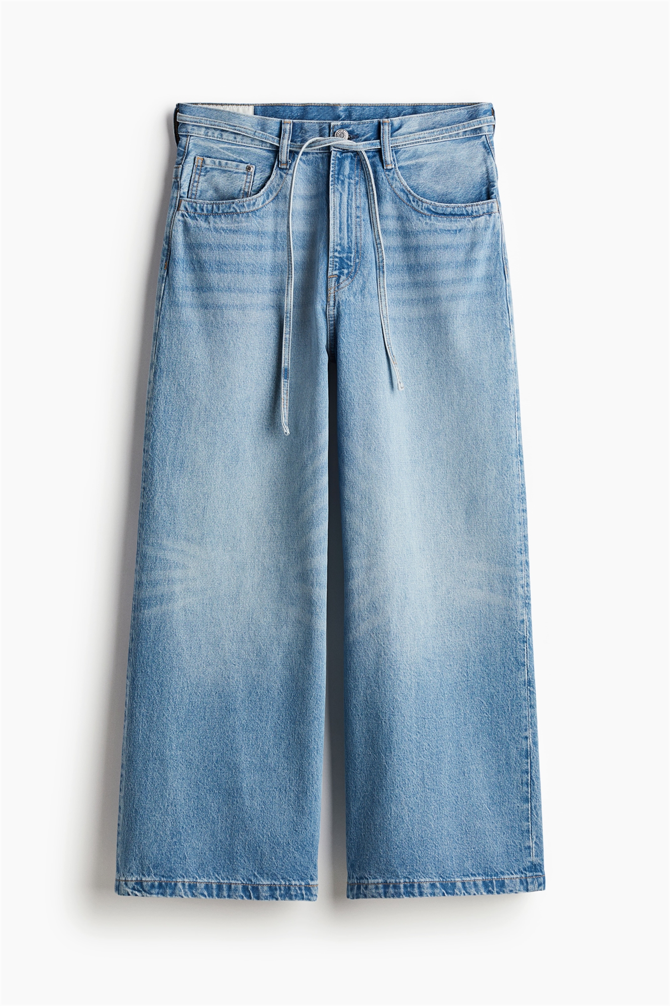 Джинсы с 5 карманами из жесткого хлопкового денима с широкими штанинами и свободной посадкой от сиденья до подола, с опущенной промежностью и дополнительным пространством по всей ноге. Ширинка на молнии и обычная талия с узким, съемным поясом-завязкой. Это джинсовая ткань, которая служит долго.