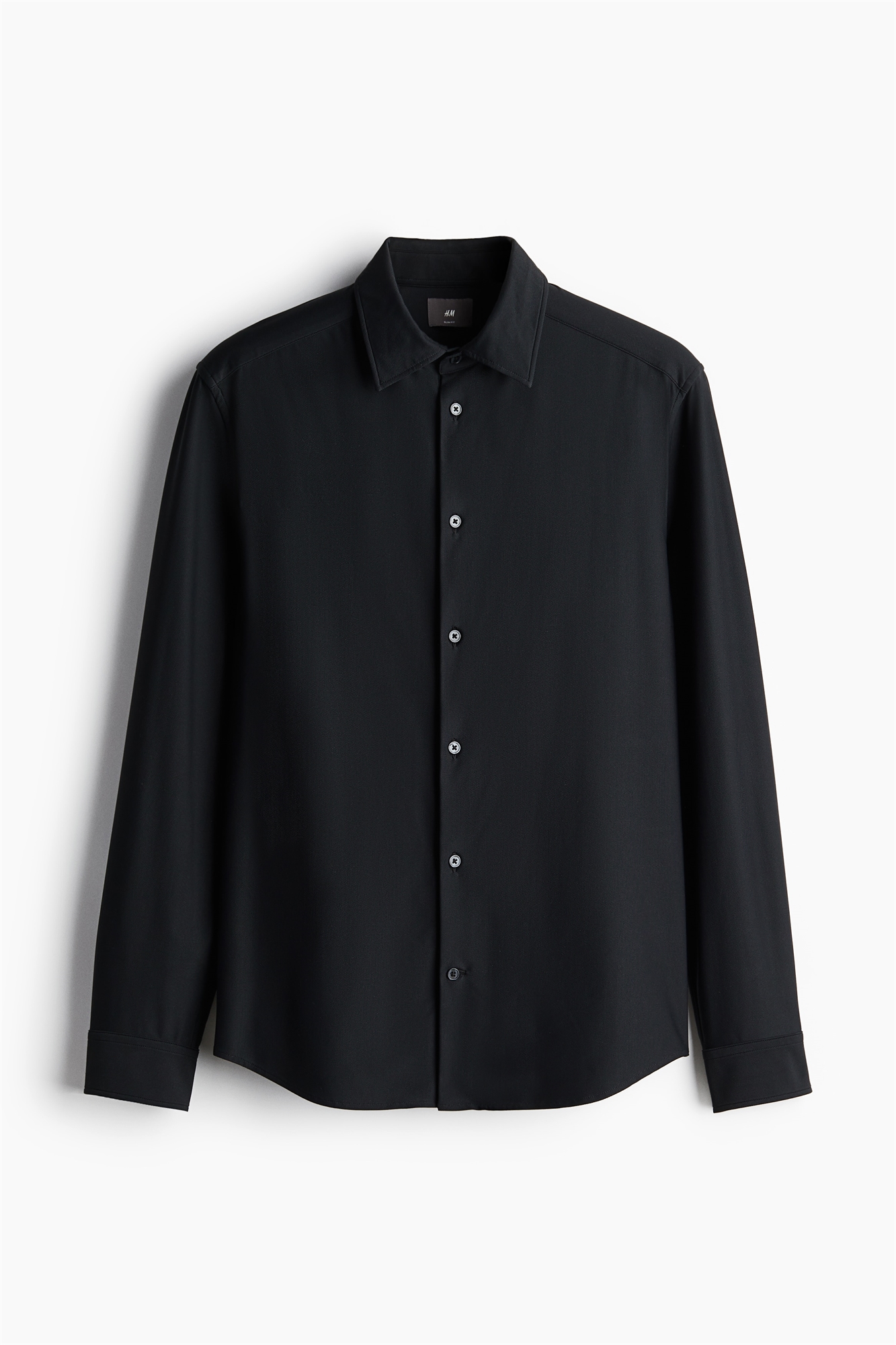 Рубашка из эластичного полотна с отложным воротником, французским передом и ярмом сзади. Длинные рукава с регулируемыми пуговицами на манжетах и рукавной планкой с пуговицей. Аккуратный закругленный подол. Зауженный крой, облегающий контуры тела и создающий приталенный силуэт.