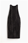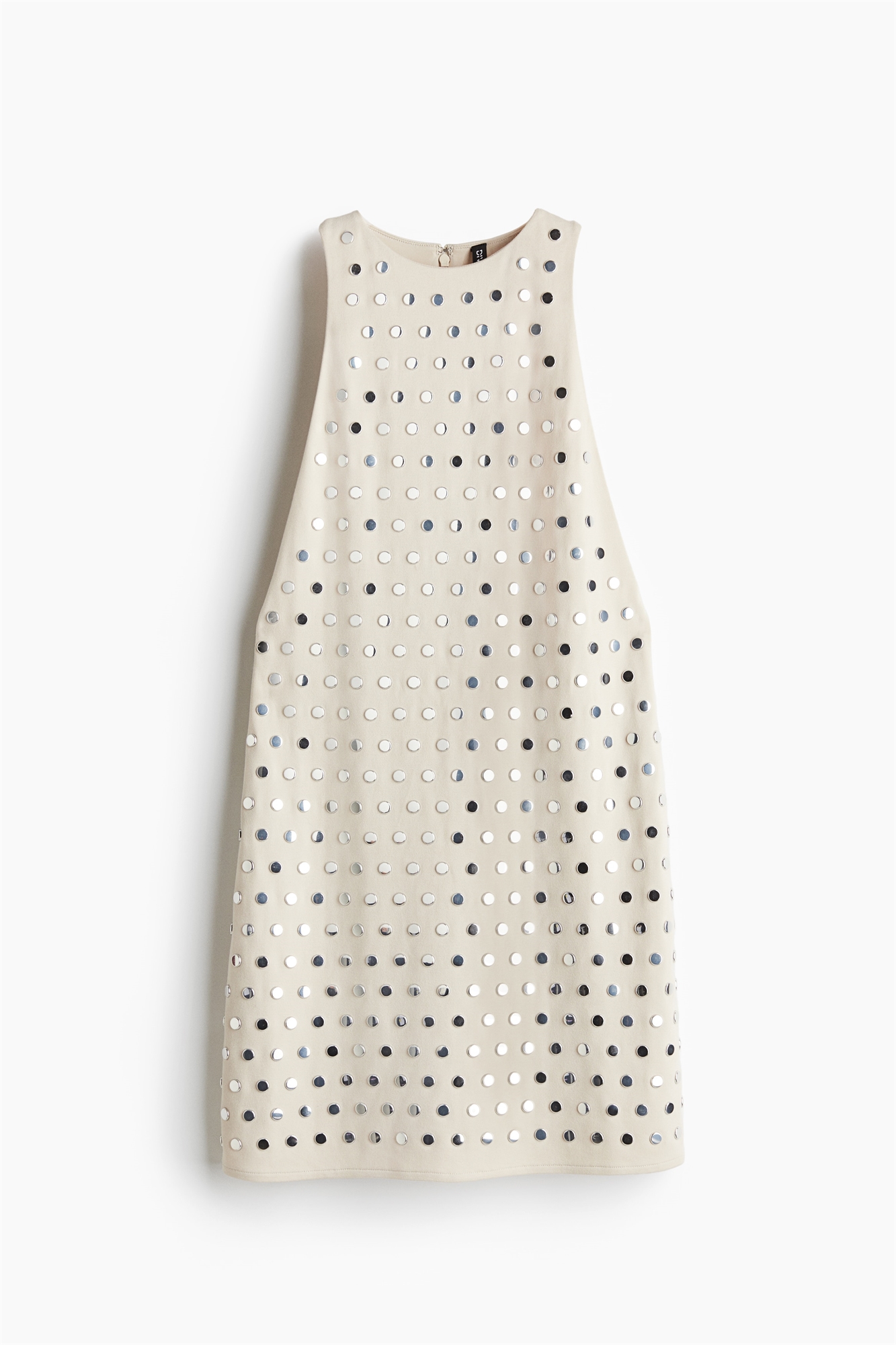 Короткое платье с вышивкой по всей длине. Круглый вырез, потайная застежка-молния сзади, глубокие проймы и спинка. Подол прямого кроя. На подкладке.