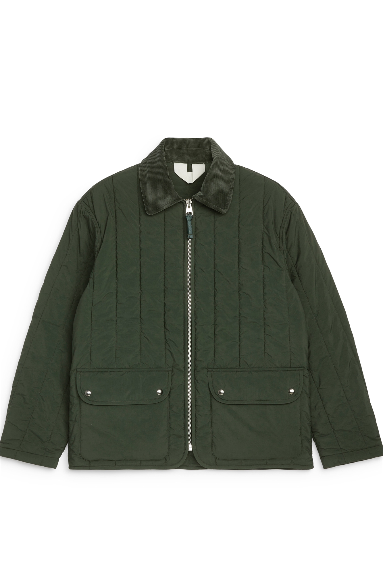 Стеганая куртка на подкладке с вельветовым воротником. Короткий фасон с застежкой на молнию и накладными карманами с клапанами. Обычный крой.