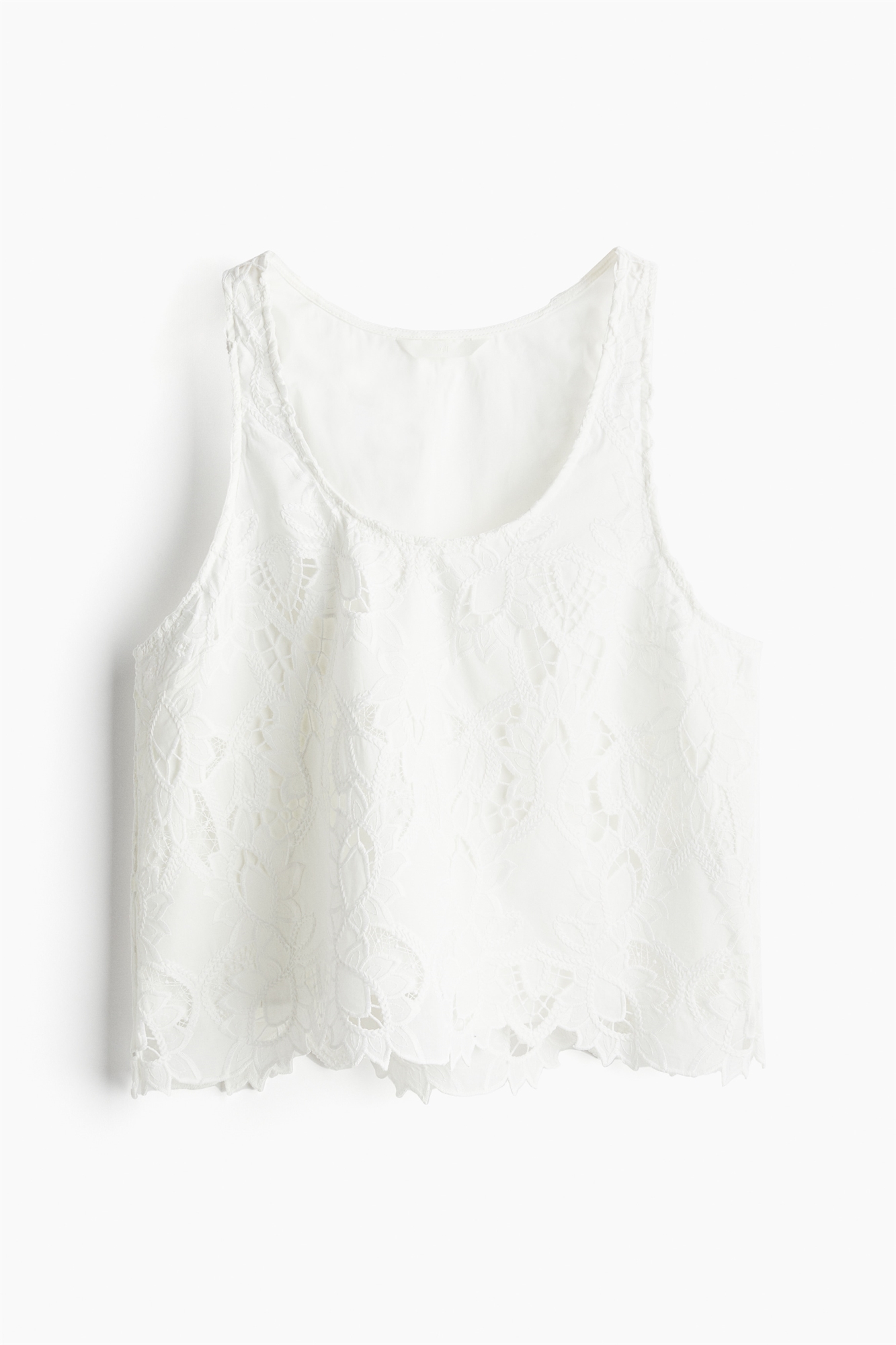 Короткий жилет свободного покроя из воздушной ткани с рисунком broderie anglaise. Вырез спереди и обрезной подол, повторяющий вышитый рисунок.