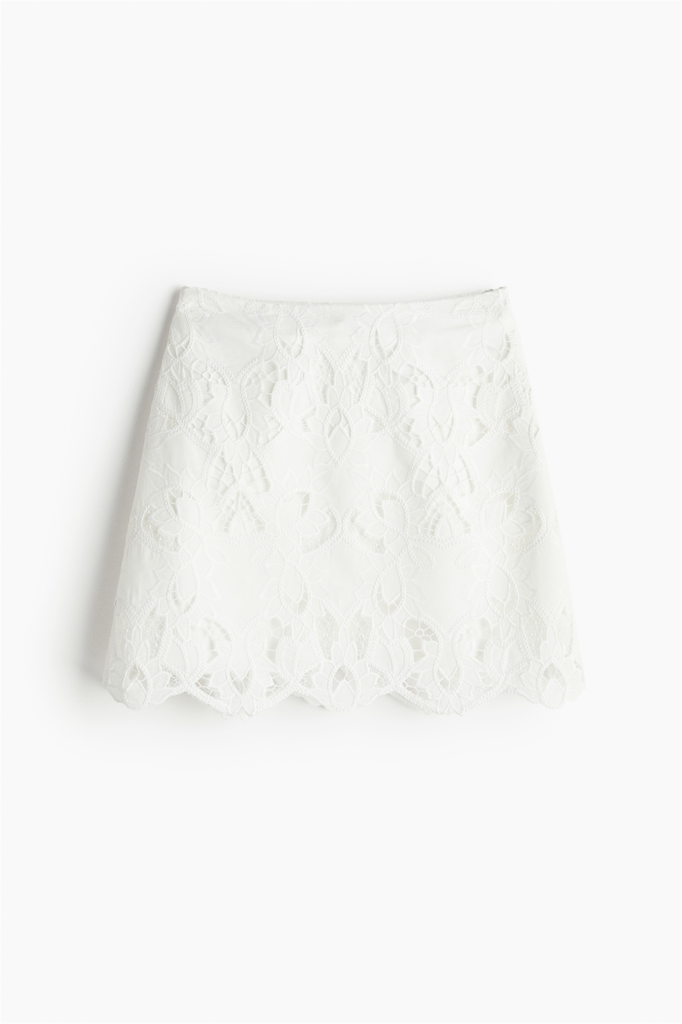 Короткая юбка из воздушного переплетения с бродери-англиз. Высокая талия, потайная застежка-молния и застежка-крючок с одной стороны, обшарпанный подол, повторяющий вышитый узор. Хлопковая подкладка.