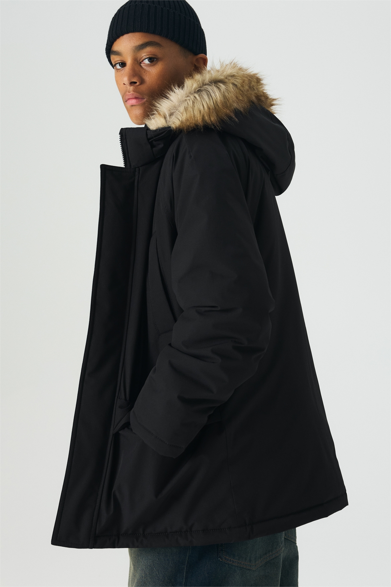 Водоотталкивающая парка с мягкой подкладкой и отстегивающимся капюшоном с пушистой отделкой. Застежка-молния спереди, ветрозащитный клапан с застежкой на крючок и петлю, накладные карманы для рук и накладные передние карманы с клапаном и застежкой на крючок и петлю. Мягкая внутренняя тесьма на манжетах. Флисовая подкладка. Парка имеет водоотталкивающее покрытие BIONIC-FINISH® ECO без фторуглеродов.