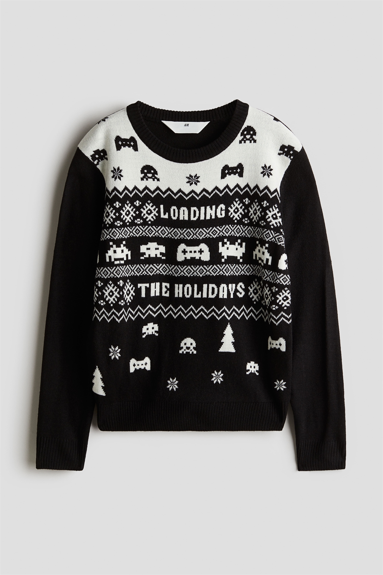 Джемпер из мягкого жаккардового трикотажа с круглым вырезом, длинными рукавами и окантовкой по вырезу, манжетам и подолу.
