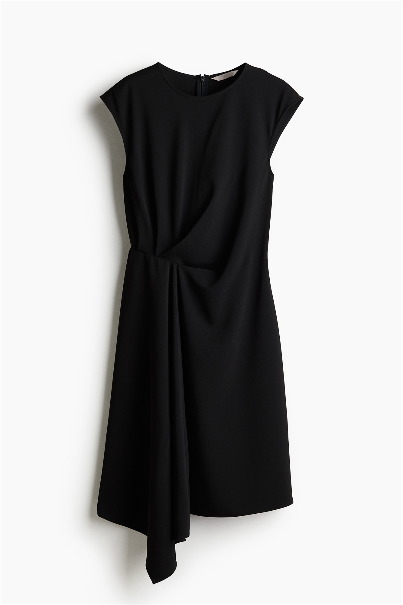 Короткое платье с рукавами из мягко драпирующегося атласа с круглым вырезом и потайной застежкой-молнией сзади. Зауженная талия со складками спереди для создания эффекта драпировки. Расклешенная юбка с асимметричным подолом. Без подкладки.