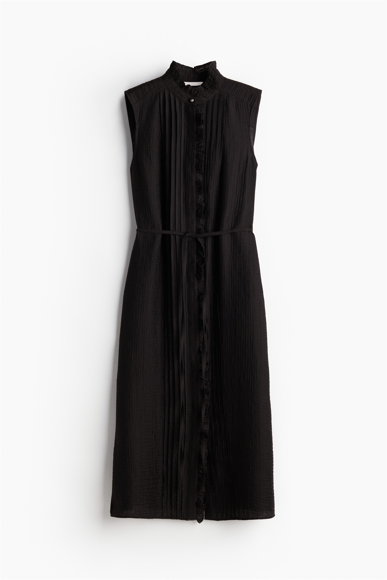 Платье без рукавов из мягкого муслина длиной до колен с воротником с оборками и двухслойным ярмом со складками сзади. Аккуратные пинетки и отделанная оборками куртка с потайными пуговицами спереди. Узкий съемный пояс-завязка на талии. Без отделки.