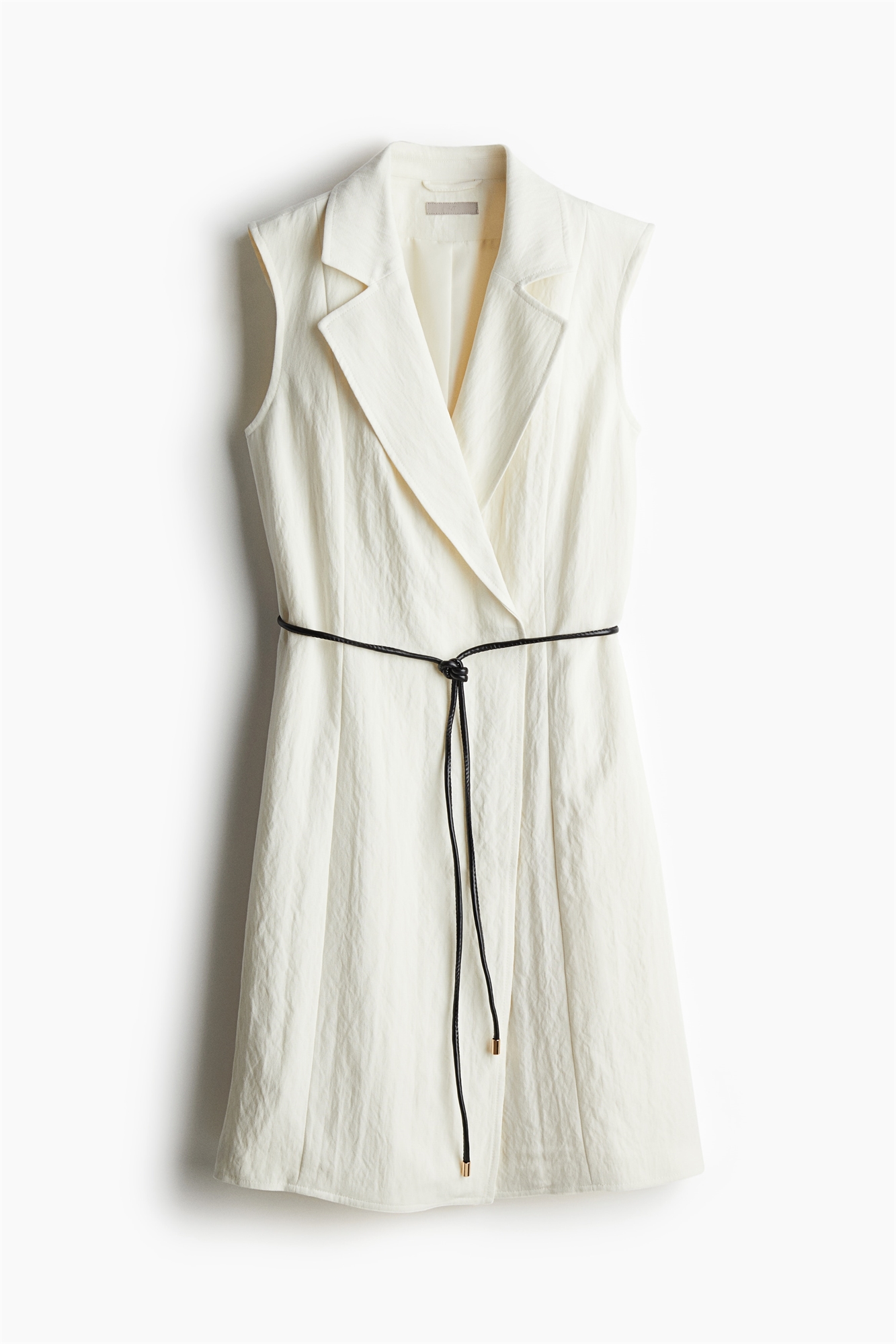 Платье-блейзер длиной до колена, без рукавов, из тканого материала, с лацканами с вырезом, застежкой на потайные пуговицы и узким съемным поясом-галстуком из ткани с покрытием. На подкладке.