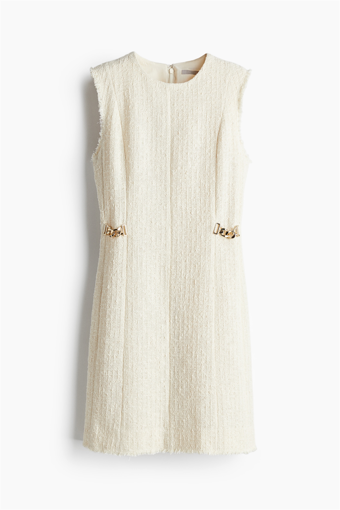 Короткое платье без рукавов из ткани букле с круглым вырезом, потайной застежкой на молнию и крючок-глаз сзади и декоративными металлическими цепочками по бокам талии. Обтрепанные края по проймам и подолу. На подкладке.