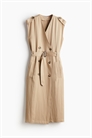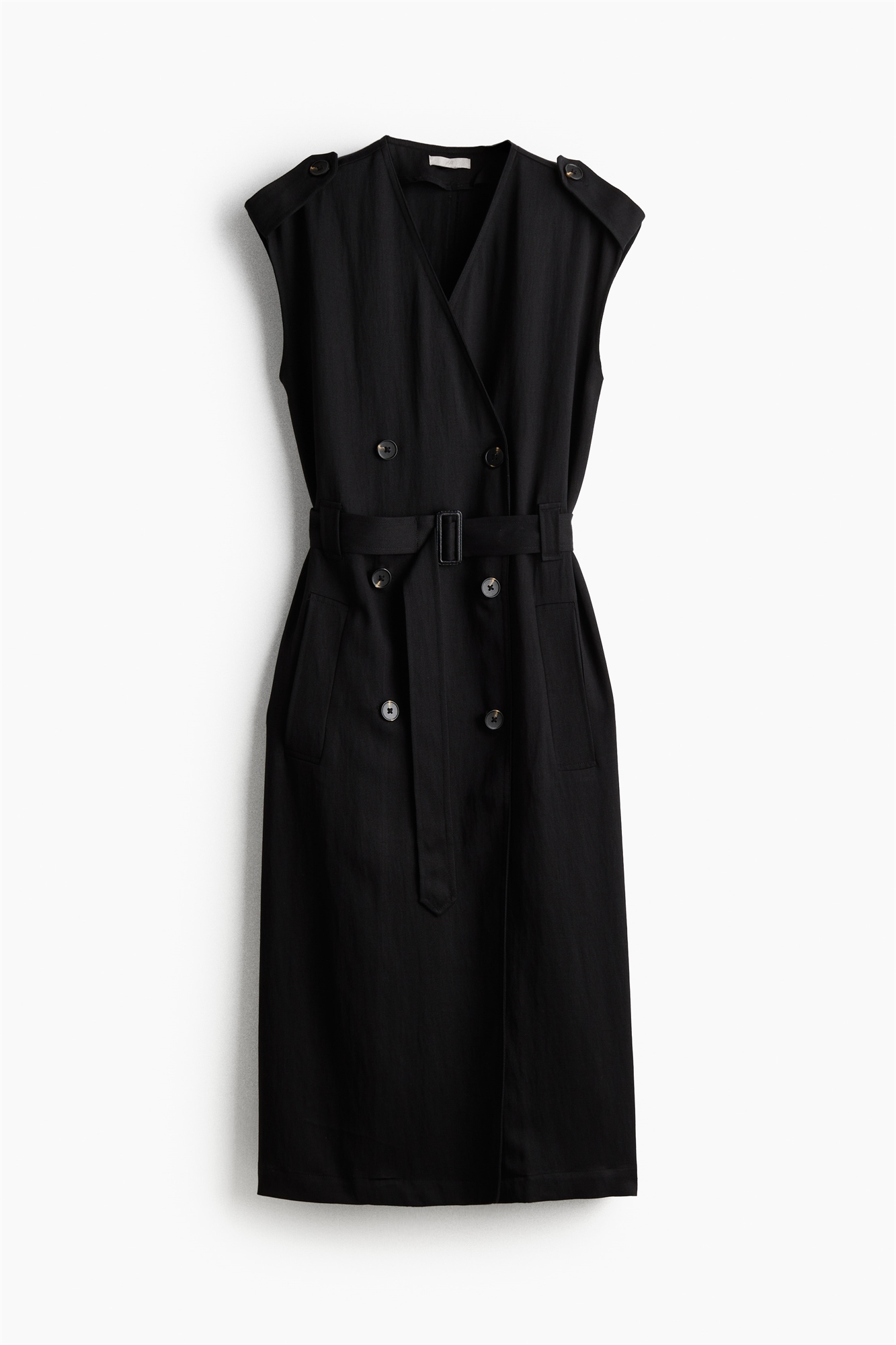 Двубортное платье длиной до колен из тканого материала без рукавов с погонами на пуговицах. V-образный вырез, втачные боковые карманы и съемный пояс с прямоугольной застежкой. Без подкладки.