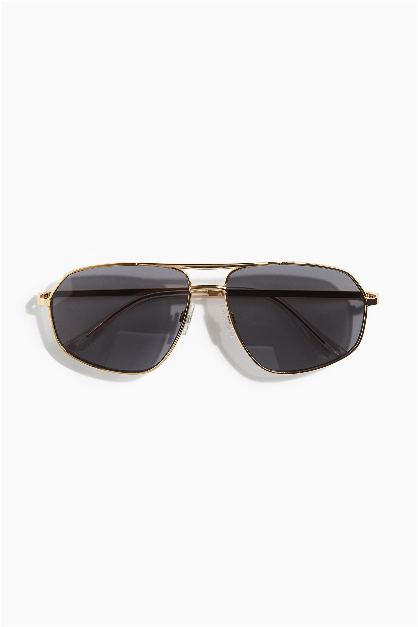 Солнцезащитные очки в стиле "авиатор" с металлической оправой и боковыми дужками. Регулируемые носовые упоры и тонированные пластиковые линзы с УФ-защитой.