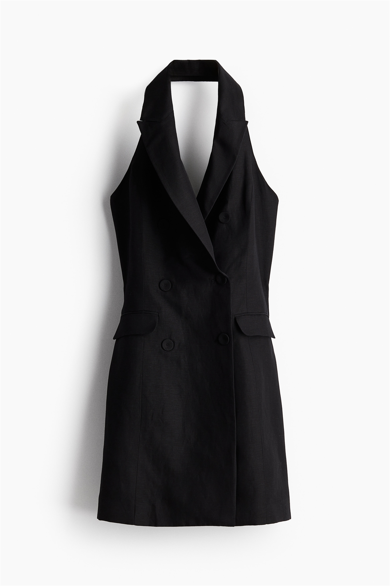 Короткое двубортное платье-блейзер с халтернеком из тканого материала, изготовленного из смеси льна и вискозы. Пикообразные лацканы, застежка на пуговицы спереди и втачные карманы с клапаном. На подкладке.
