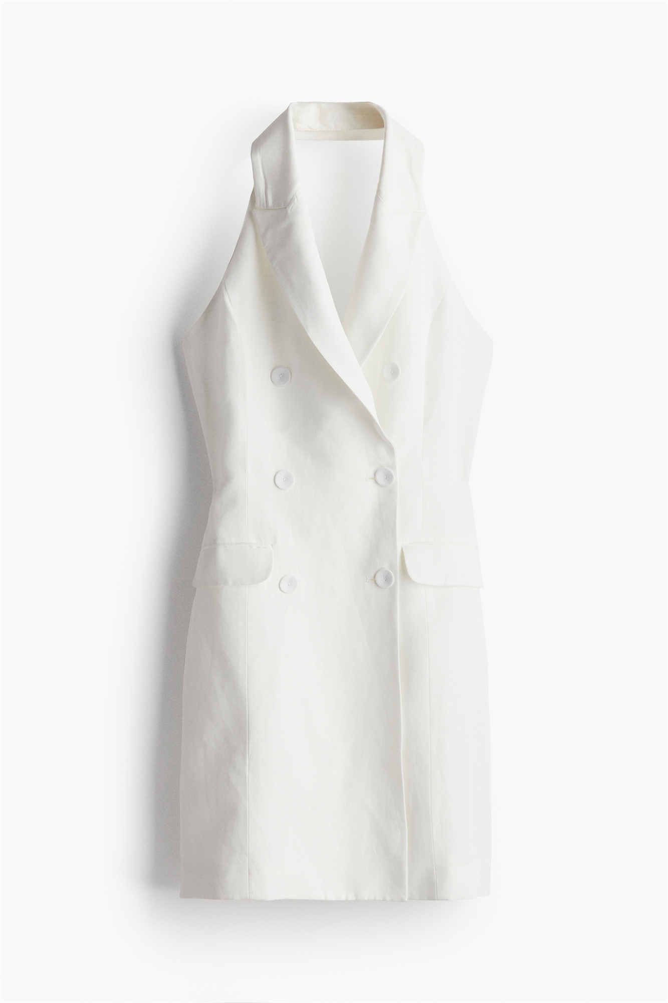 Короткое двубортное платье-блейзер с халтернеком из тканого материала, изготовленного из смеси льна и вискозы. Пикообразные лацканы, застежка на пуговицы спереди и втачные карманы с клапаном. На подкладке.