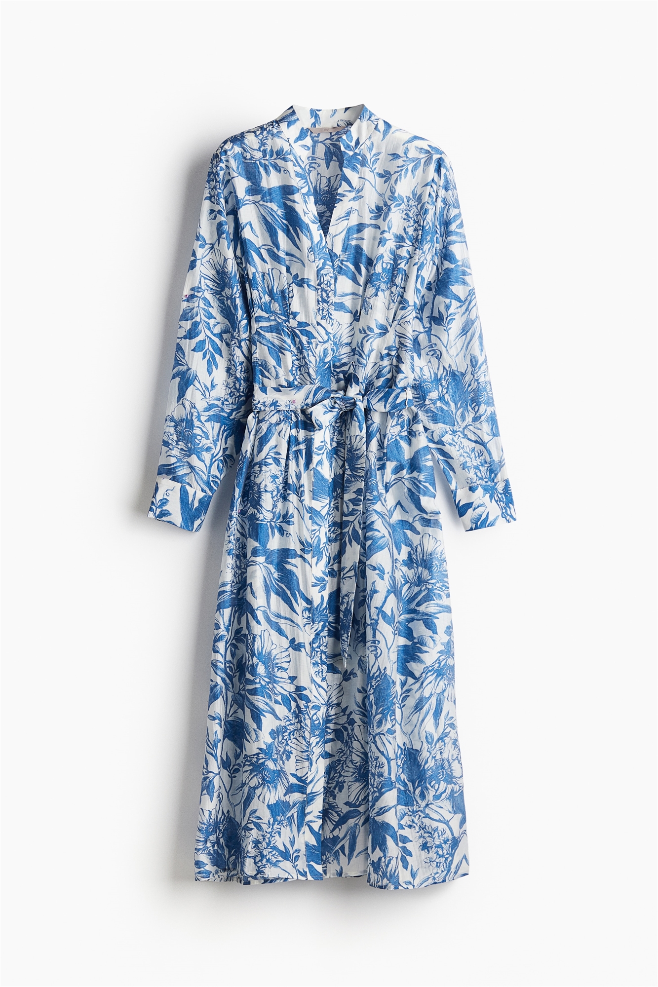 Платье длиной до щиколоток из тканого материала с воротником-бантом, V-образной проймой и потайной застежкой на пуговицы спереди. Длинные рукава и широкие манжеты с закрытыми пуговицами. Съемный пояс с завязками и складки спереди и сзади для мягкого сужения талии. Без отделки.
