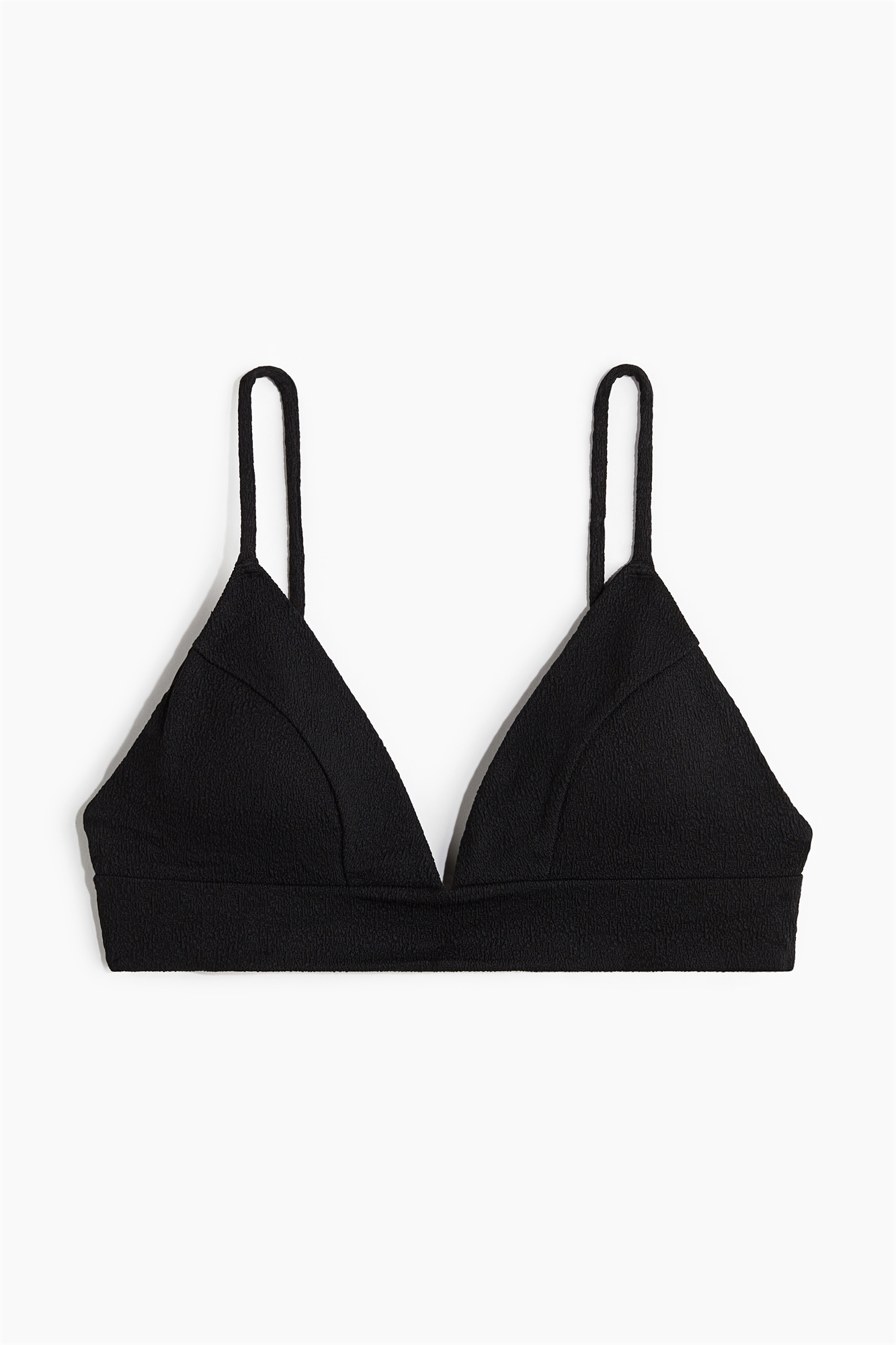 Бикини-треугольник на подкладке из фактурной ткани с узкими регулируемыми бретелями и чашечками со съемными вкладышами, придающими форму бюсту и обеспечивающими хорошую поддержку. Без застежек.