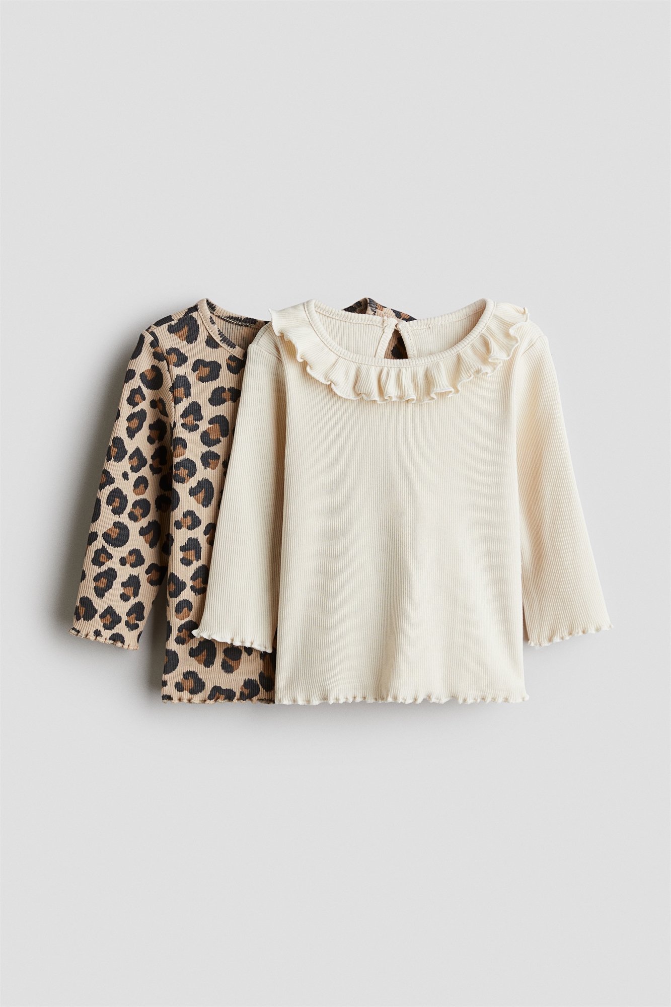 Топы с длинными рукавами из ребристого хлопкового джерси. Круглый вырез, украшенный маленьким атласным бантиком, отверстие для ключа с пуговицей сзади и оверлочные края на манжетах и подоле.