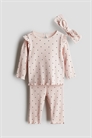 Комплект из топа и леггинсов из ребристого хлопкового джерси с отделкой оверлоком и подходящей повязкой на голову. Топ с длинными рукавами, круглым вырезом, оборкой на плечах и отверстием для ключа с пуговицей сзади на шее. Леггинсы с регулируемой эластичной талией. Повязка на голову с бантом спереди и резинкой сзади.