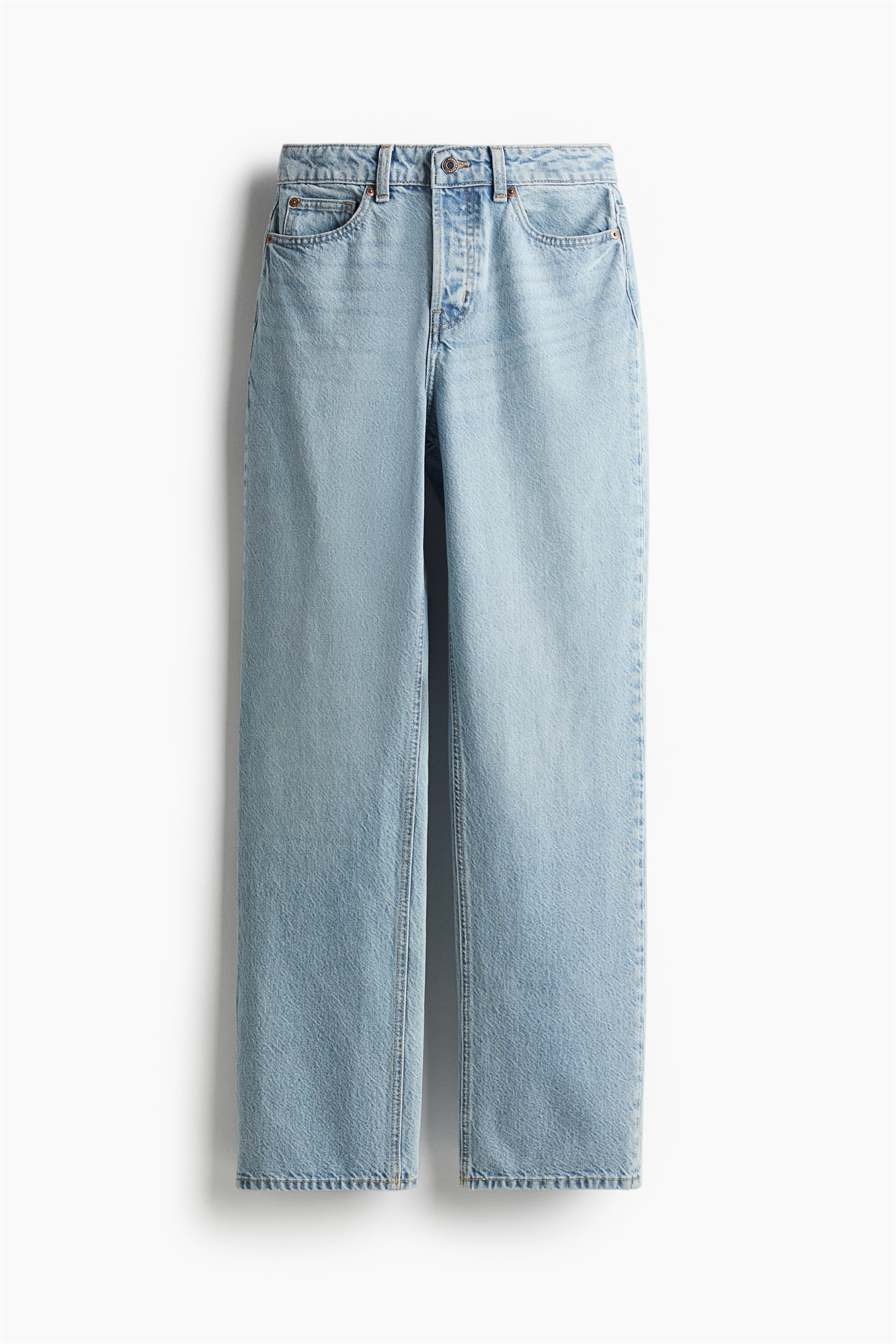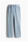 Джинсы с 5 карманами из прочного денима, изготовленного из смеси хлопка и вискозы. Высокая талия, ширинка на пуговицах и прямые ноги.