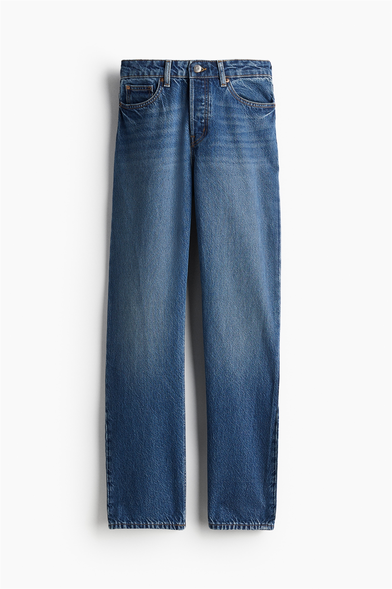 Джинсы с 5 карманами из прочного денима, изготовленного из смеси хлопка и вискозы. Высокая талия, ширинка на пуговицах и прямые ноги.