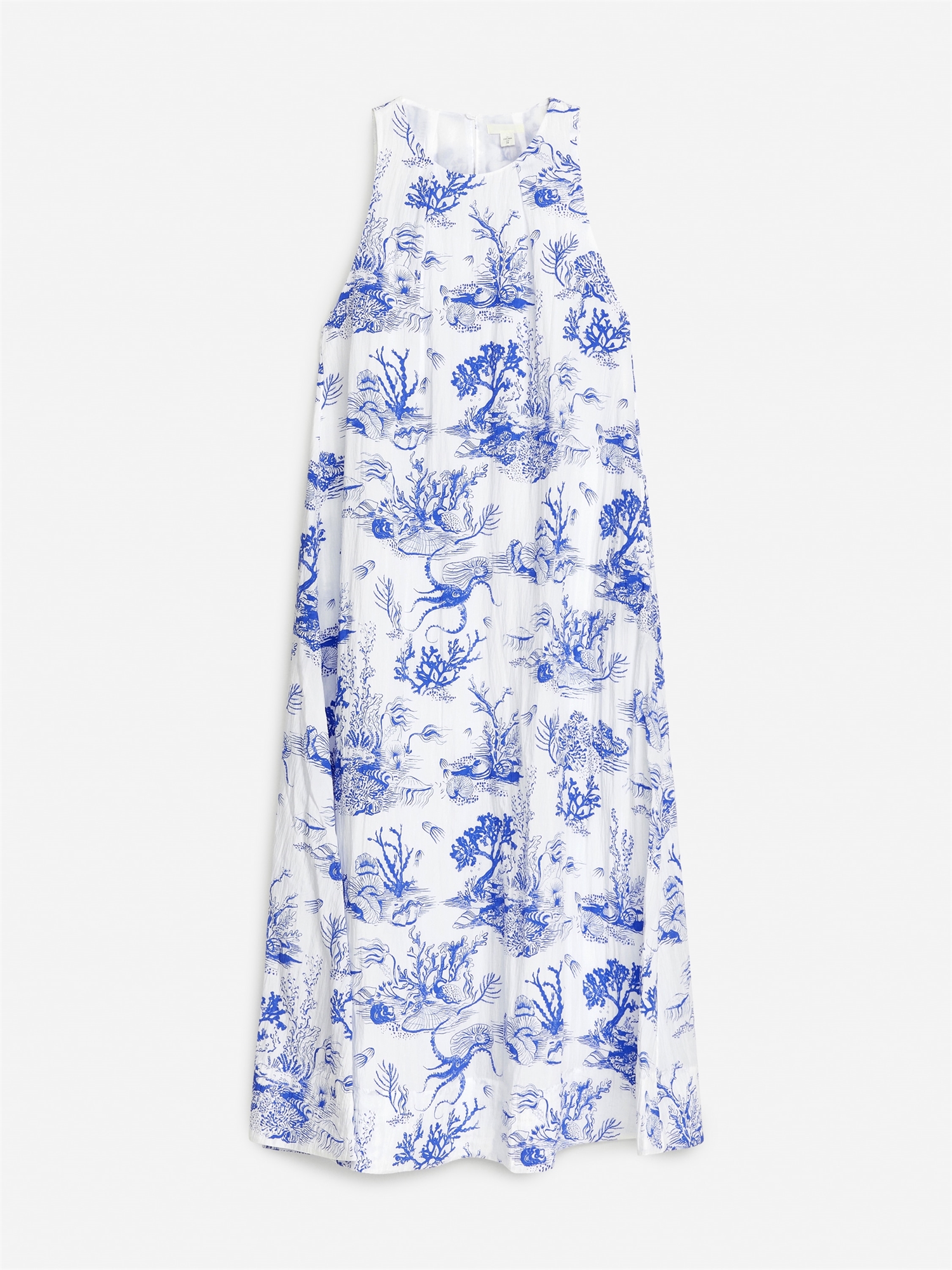 Платье без рукавов сшито из вискозы. Фасон в форме трапеции, со складками на вырезе и отверстием под замочную скважину с застежкой на пуговицу сзади.