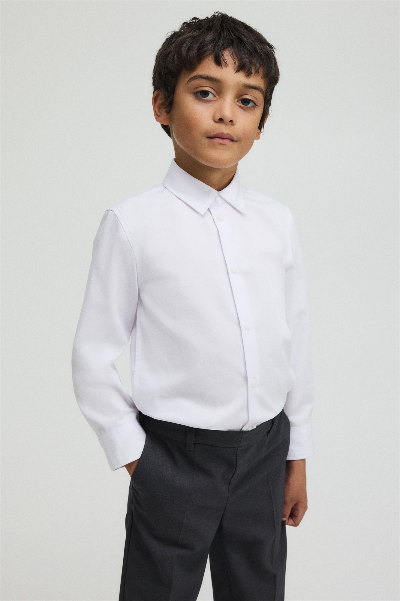 Школьные рубашки из тканого материала с легкой глажкой. Воротник, застежка на пуговицах спереди, передняя часть и длинные рукава с манжетами на пуговицах. Закругленный подол.