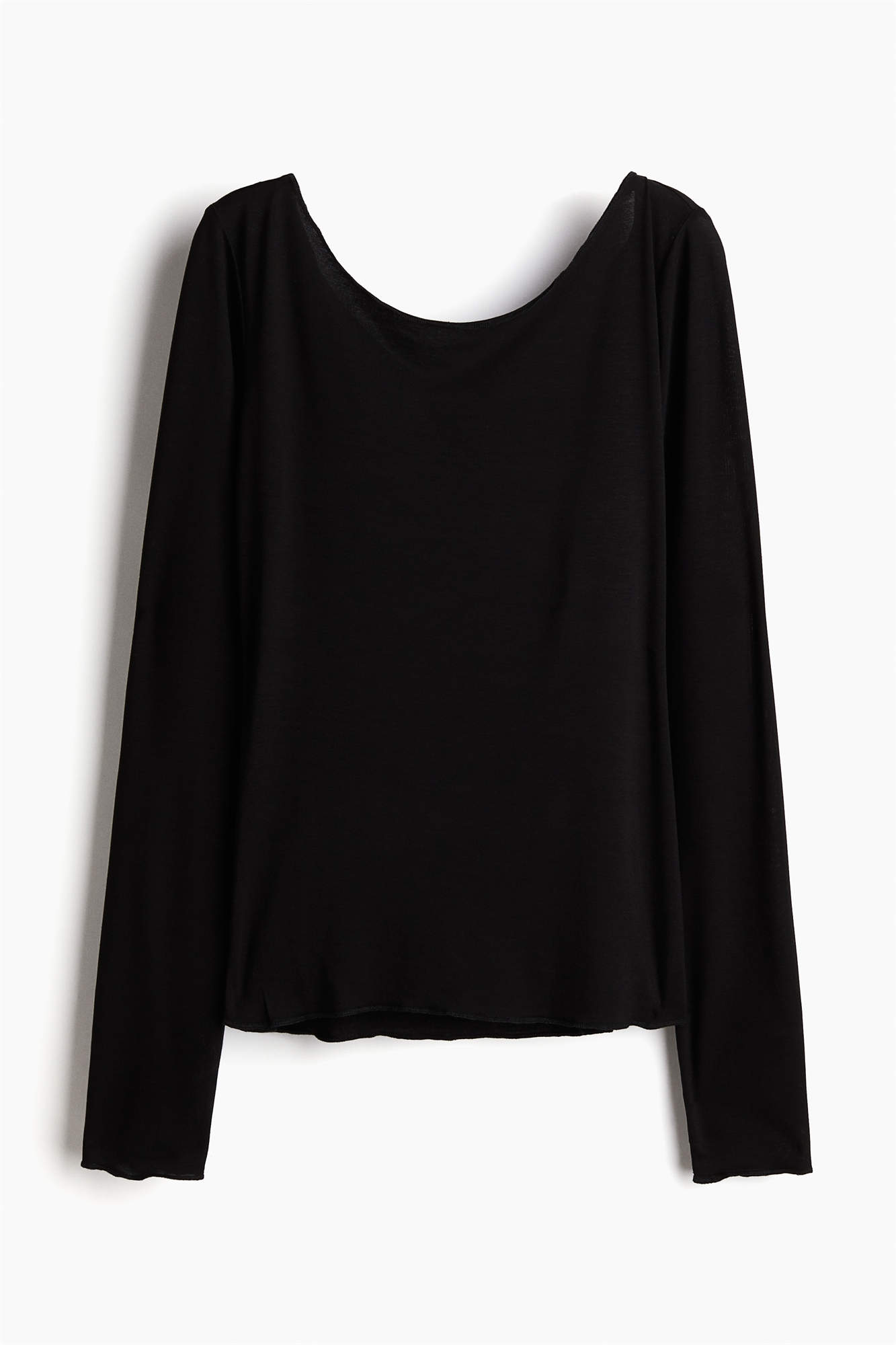 Облегающая фигуру рубашка из лиоцеллового джерси с оверлочными краями. Вырез бато, длинные рукава и прямой подол.