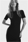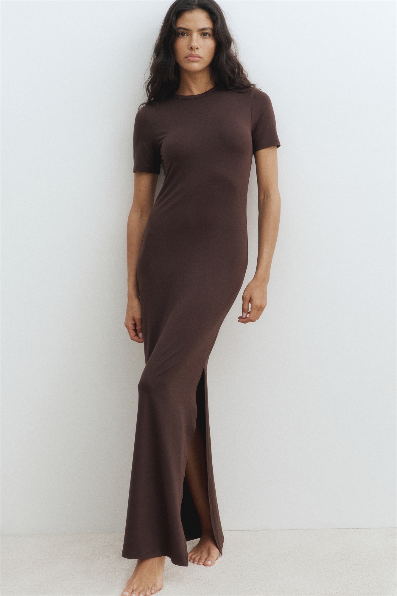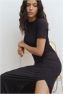 Приталенное платье-футболка длиной до щиколоток из мягкого стрейчевого джерси с узкой окантовкой по вырезу горловины и прямым подолом с разрезом с одной стороны.