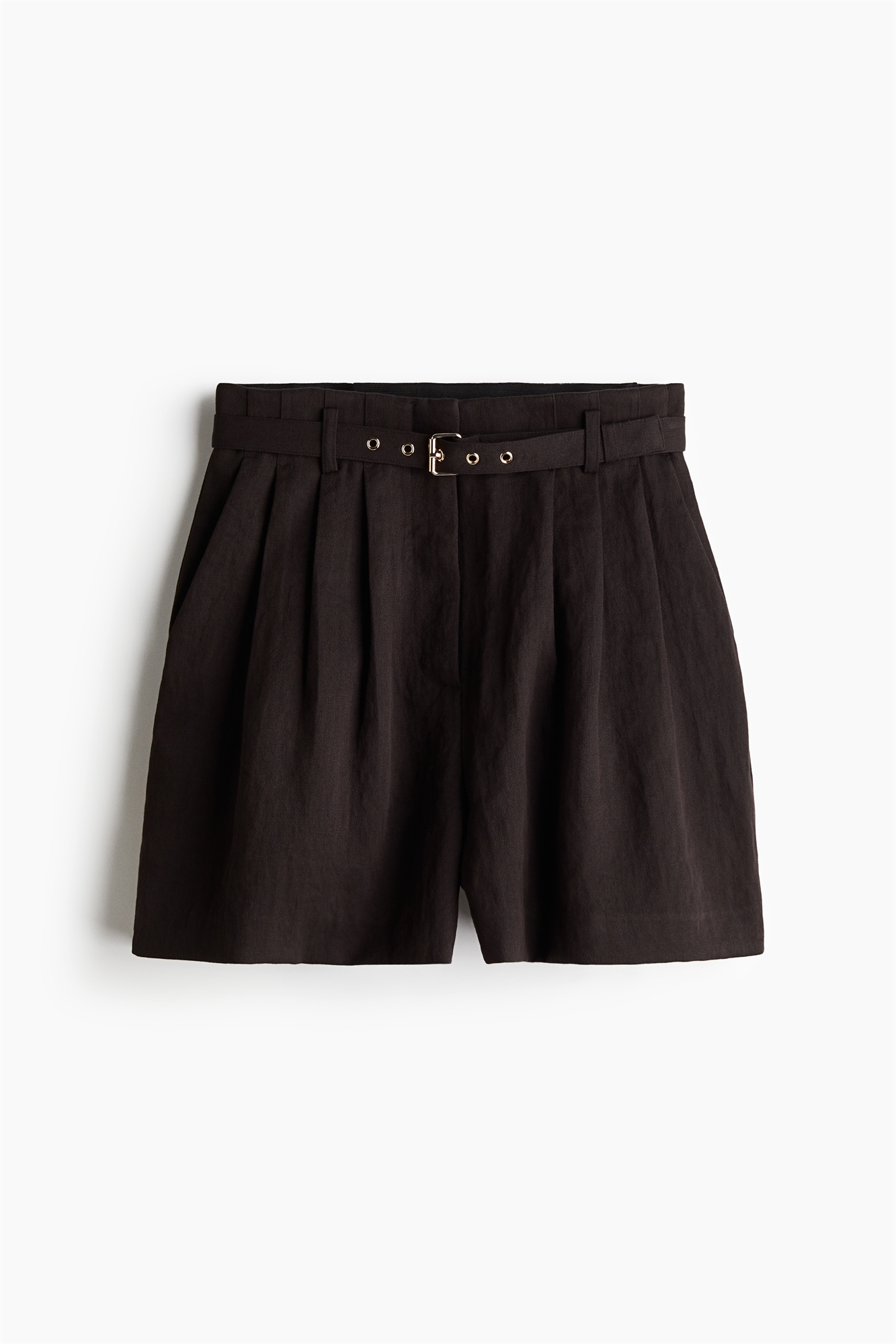 Шорты свободного покроя из саржи с высокой талией в виде бумажного пакета со складками и узким поясом с металлической пряжкой. Ширинка на молнии со скрытыми застежками-крючками, диагональные боковые карманы и втачные карманы сзади.