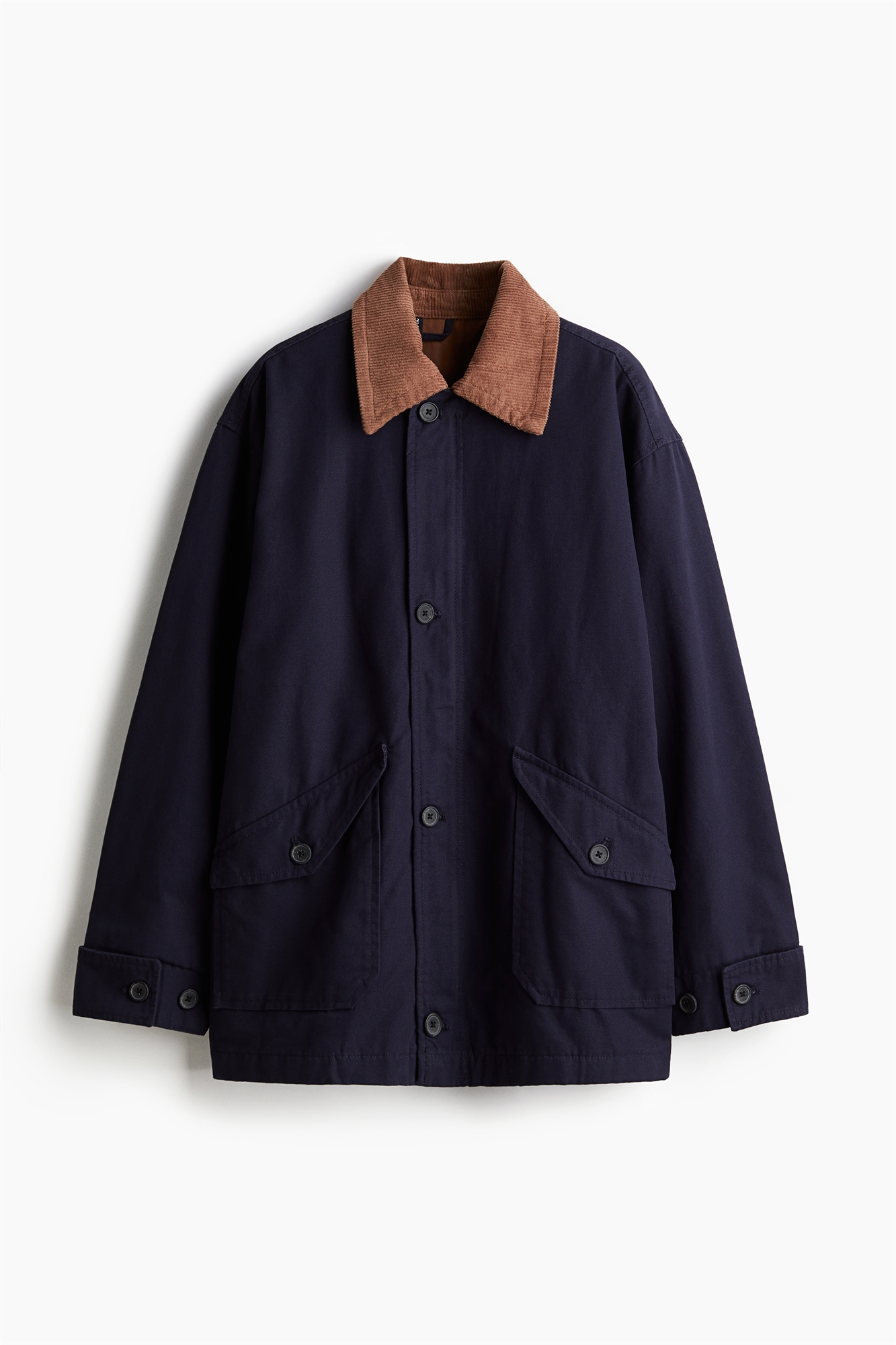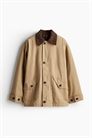 Куртка оверсайз из хлопкового холста с вельветовым воротником, застежкой на молнию и ветрозащитным клапаном с кнопками спереди. Спущенные плечи и длинные рукава с вставкой и регулируемыми пуговицами на манжетах. Накладные передние карманы с кнопкой. На подкладке.