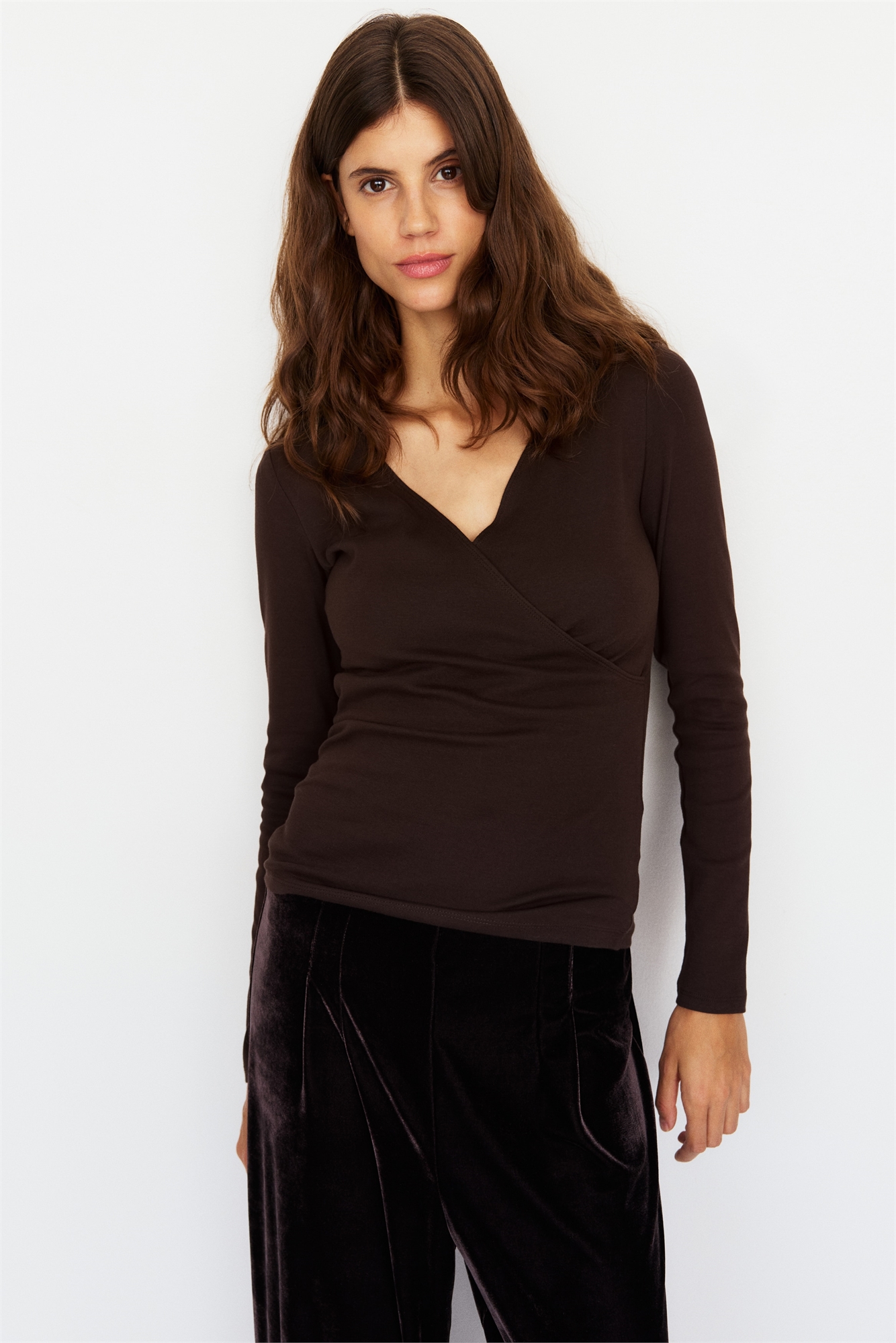 Топ для кормящих из ребристого хлопкового джерси с V-образным вырезом и длинными рукавами. Заворачивающийся верх и практичная внутренняя часть для облегчения доступа к груди.