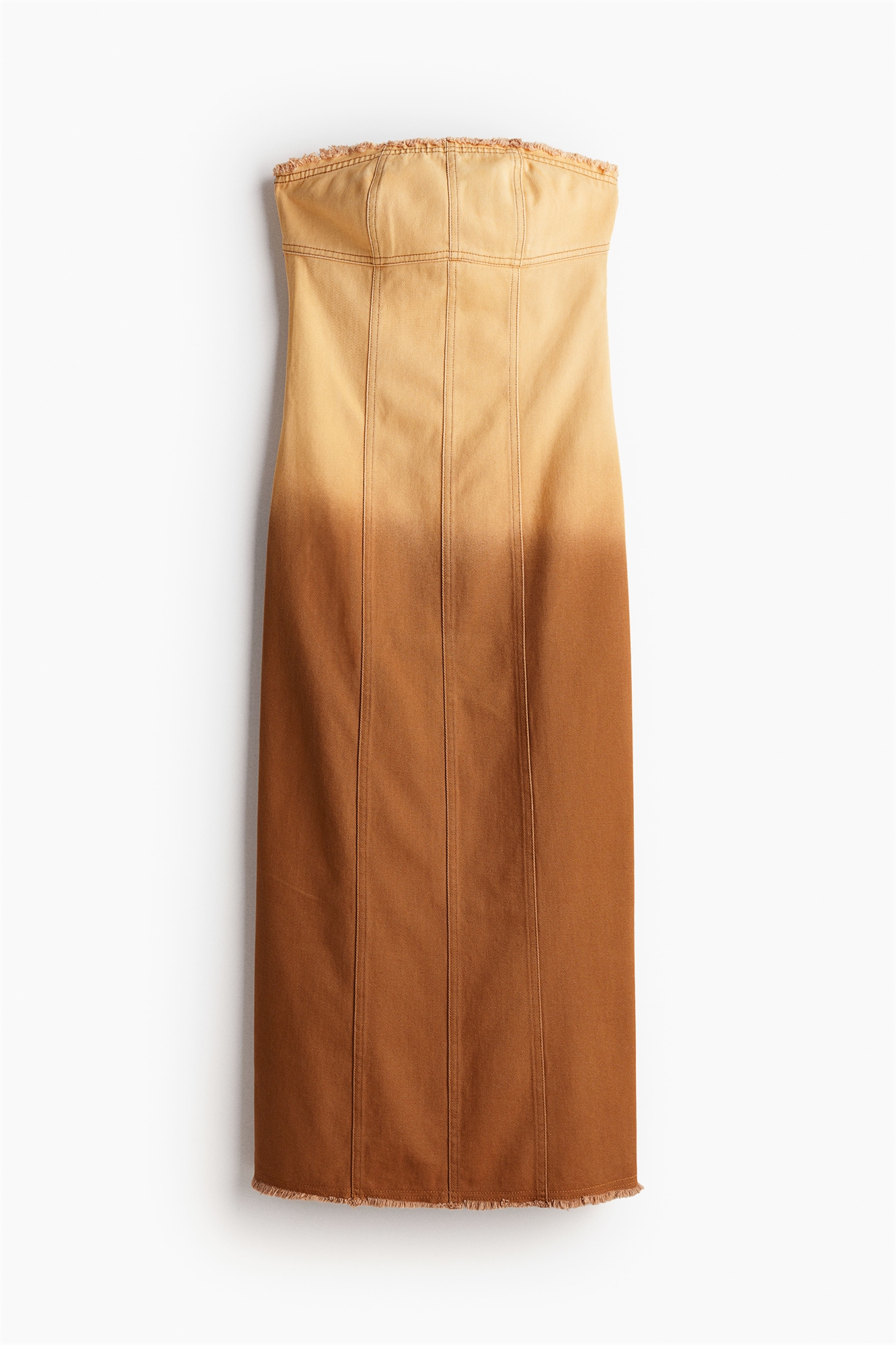 Приталенное платье-бандо длиной до колен из хлопковой саржи с видимыми швами под бюстом, спереди и сзади. Застежка-молния сзади и обтрепанные края по верху и подолу. На подкладке.