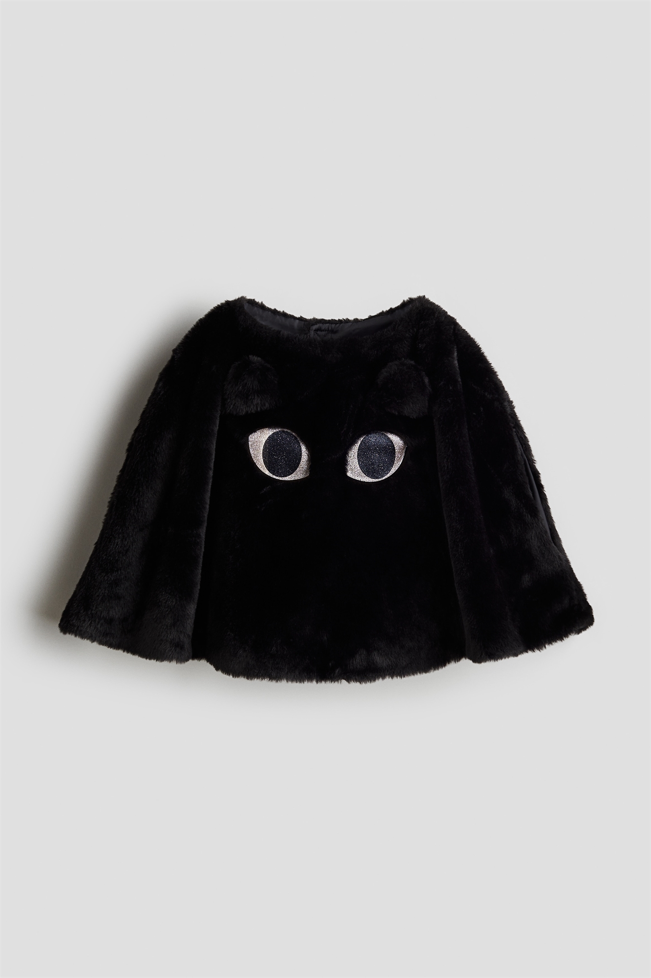 Накидка для маскарадного костюма из мягкой пушистой ткани с аппликацией в виде ушей и глаз спереди. Круглый вырез, проймы по бокам, застежка на крючок и петлю сзади на шее. На подкладке.