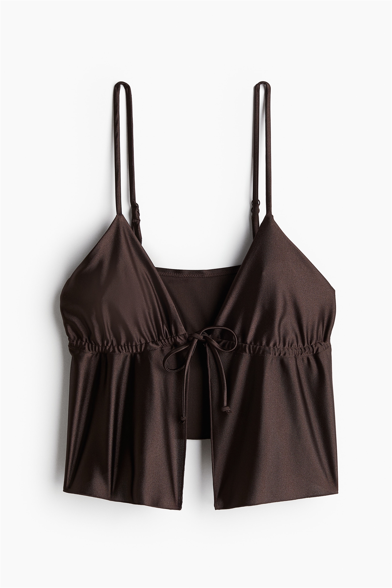 Облегающий купальный топ с V-образным вырезом, узкими регулируемыми бретелями и чашечками, которые придают бюсту естественную форму и обеспечивают легкую поддержку. Открытая передняя часть с завязками по центру бюста. На подкладке.