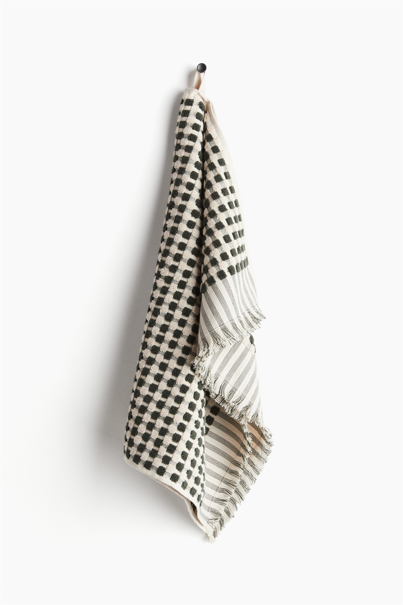 Полотенце для рук из хлопковой махры с узором по всей поверхности и необработанными краями с бахромой придаст современной нотки вашей ванной комнате. GSM 450.