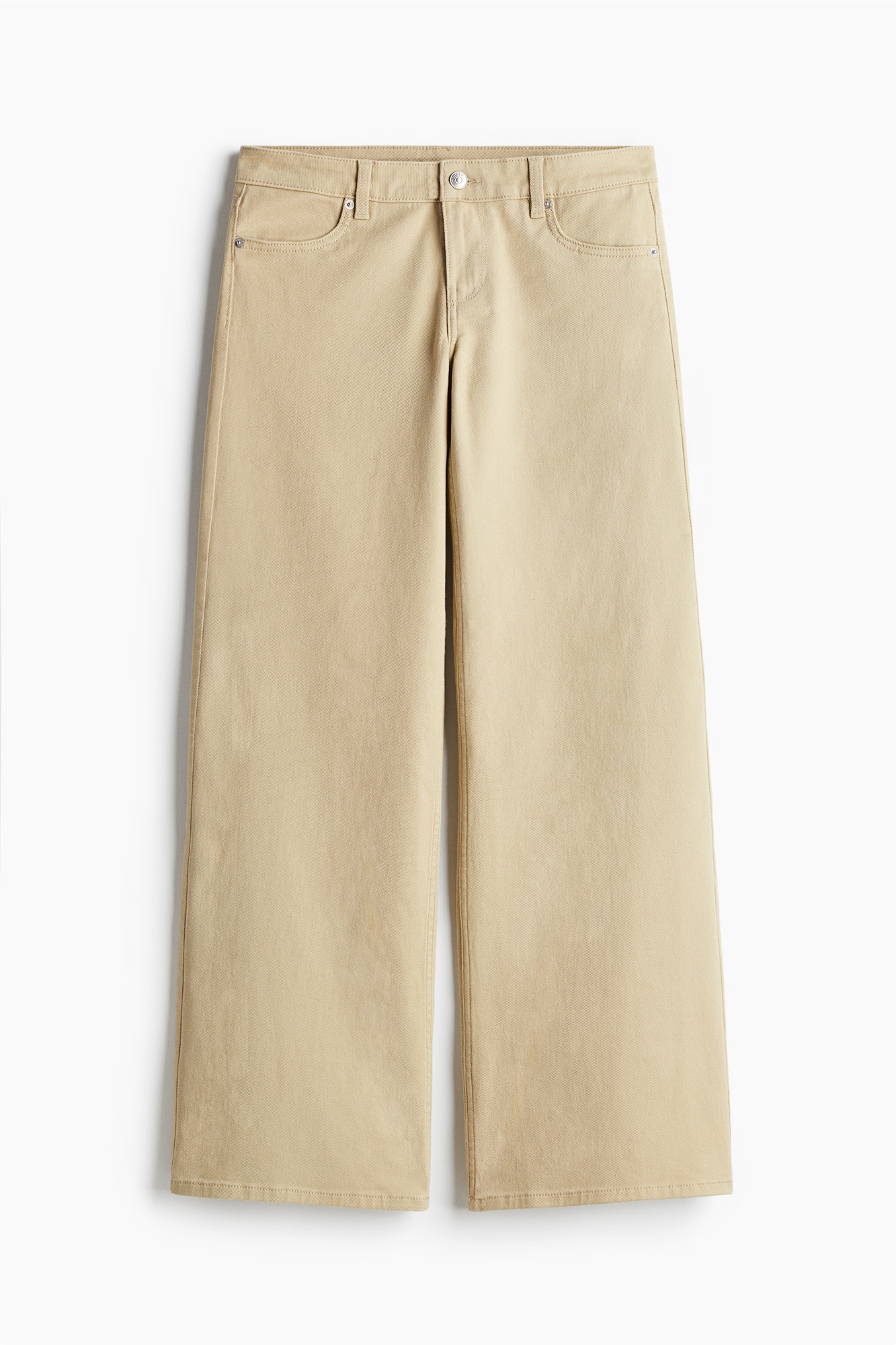 Брюки из хлопковой саржи с низкой талией, застежкой на молнию и пуговицу. Фальшивые передние карманы, настоящие задние карманы и широкие ноги.