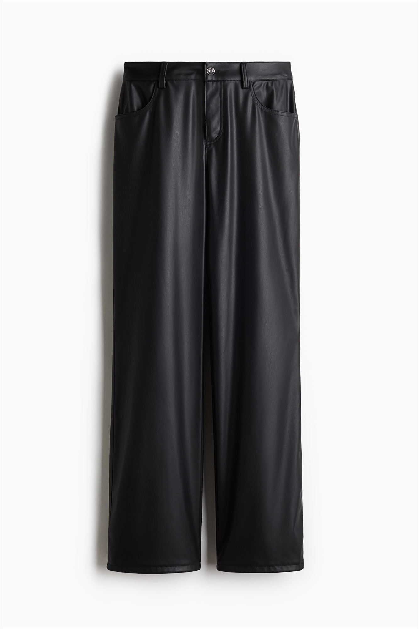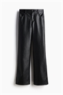 Брюки свободного кроя из ткани с покрытием. Ширинка на молнии с пуговицей, передние и задние карманы и прямые ноги.